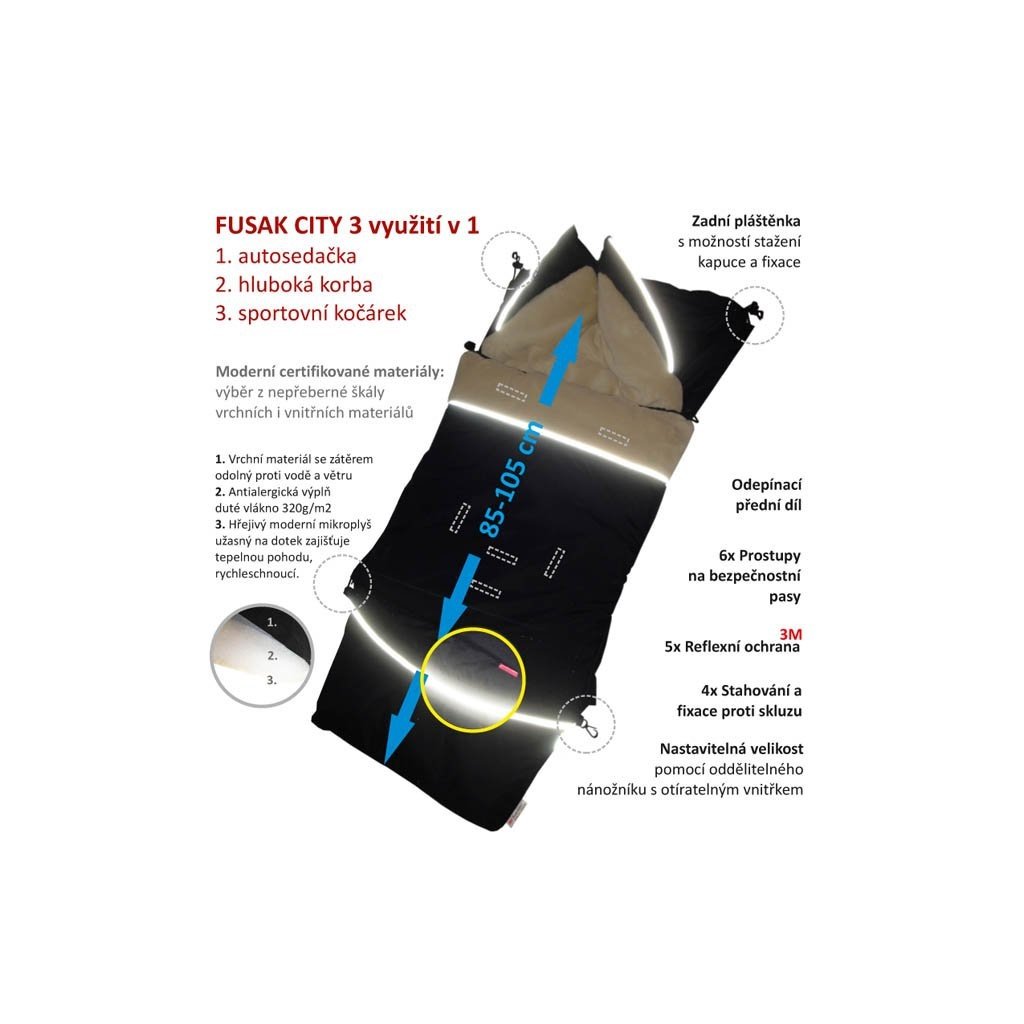 Kvalitní reflexní prvky zajišťují bezpečnost Vás i Vašeho děťátka, jsou nezbytností a v současnosti i povinností v dopravním provozu! Šest universálních prostupů pro použití bezpečnostních popruhů na kočárku i autosedačce. Další zajištění fusaku proti sklouzávání pomocí fixačních karabin na zadní pláštěnce a předním díle - tento mechanický způsob je nejúčinnější! Celoodepínací přední díl a nánožník usnadňuje manipulaci s děťátkem a poskytuje tepelný komfort s možností větrání, stahování předního dílu pomocí pružné gumy, která lze snadno regulovat praktickými brzdičkami, zajišťuje zvýšený tepelný komfort. Rozepínací kapuce v kombinaci se stahováním zadní pláštěnky a předního dílu umožní ochránit Vaše děťátko před nepřízní počasí, z fusaku tak snadno vytvoříte uzavřenou mumii (vhodné pro novorozeňátka - stahovací gumy jsou pružné a lehce ovladatelné). Vnitřek nánožníku je z důvodu zvýšené zátěže opatřen otíratelným materiálem (umožňuje využití fusaku i bez sundávání botiček).