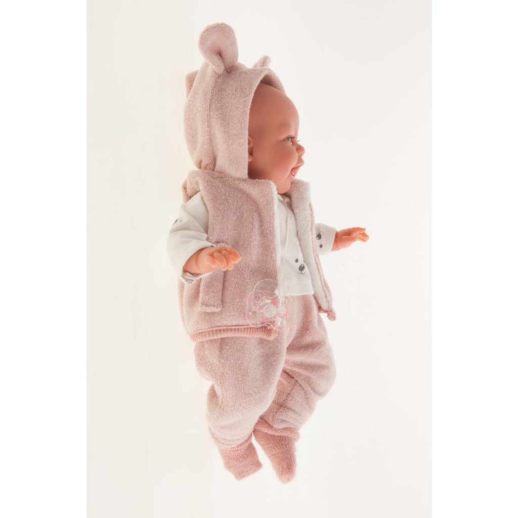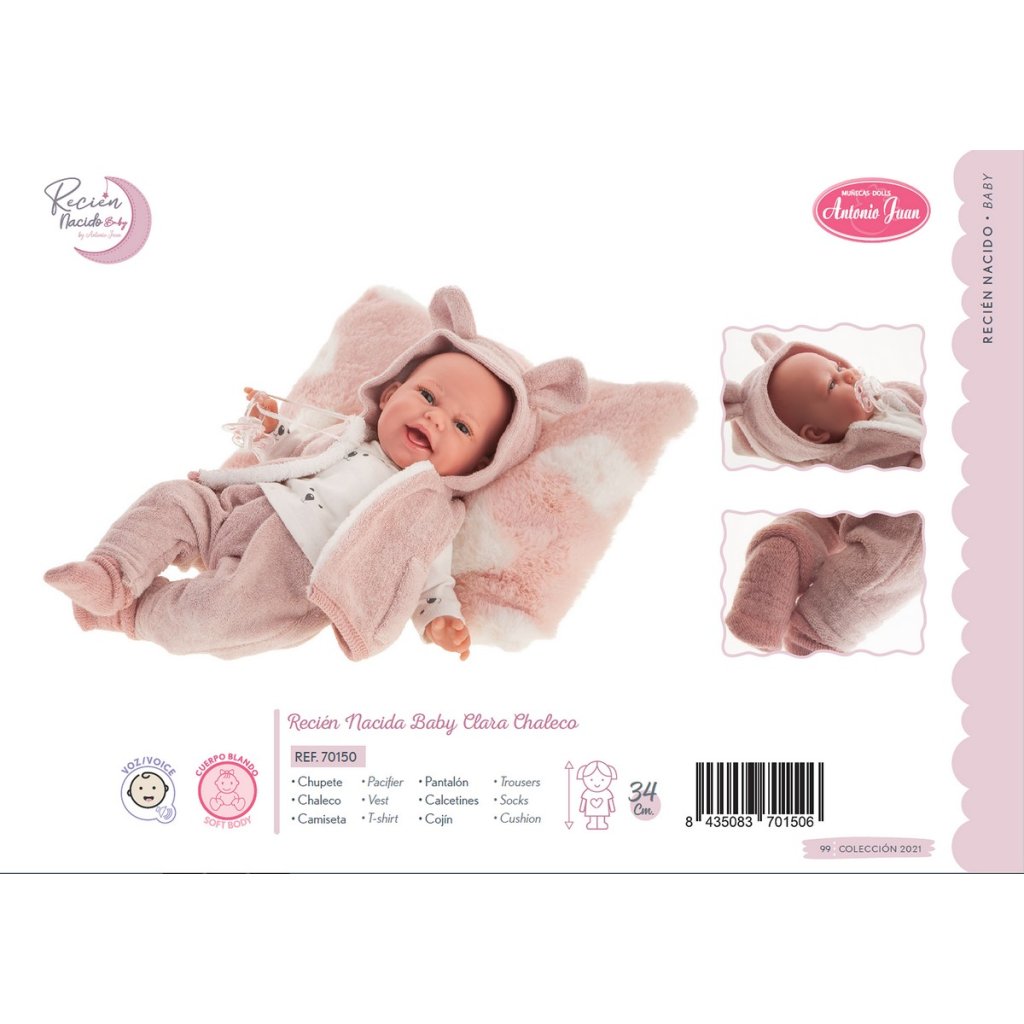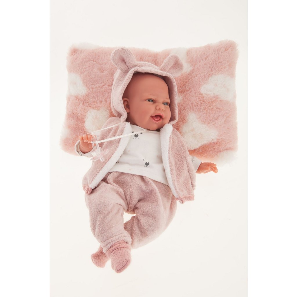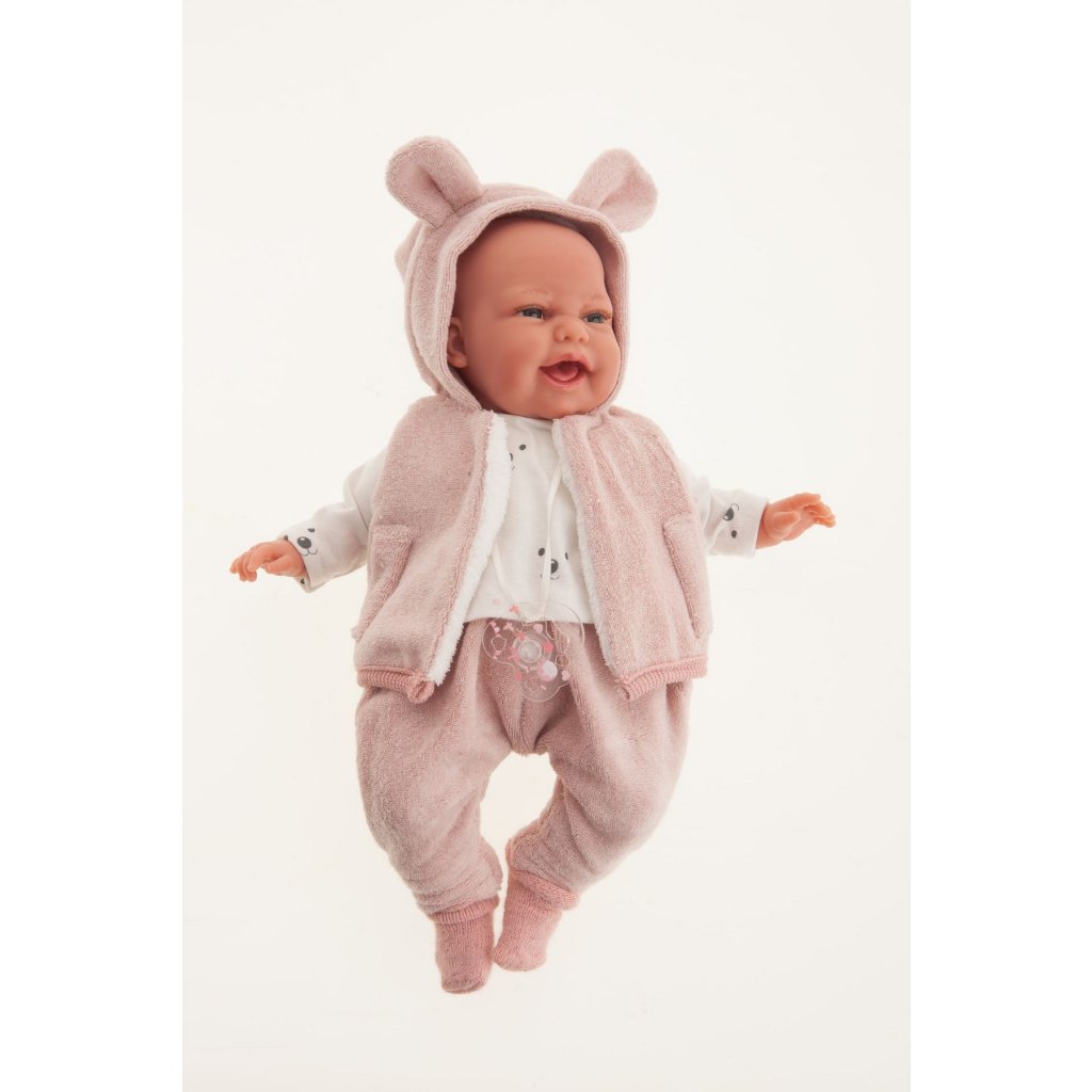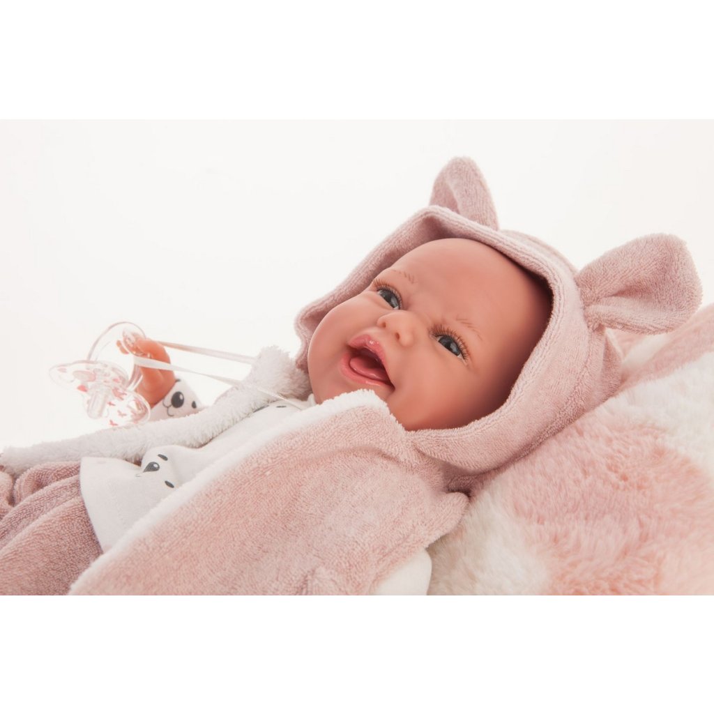 Mluvící, ručně vyrobená realistická španělská panenka - miminko. Po zatlačení na bříško začne panenka vydávat zvuky podobné dětskému žvatlání. Panenka má měkké látkové tělo, hlava a končetiny jsou vyrobené z kvalitního měkčeného vinylu. Oblečení panenky bylo vyrobeno z organické bavlny, která zaručuje výrobu z ručně sbírané, ekologicky bez chemického ošetření pěstované bavlny. Firma Antonio Juan klade velký důraz na ekologii, a proto jako první využívá v tomto odvětví zmíněnou bavlnu.
