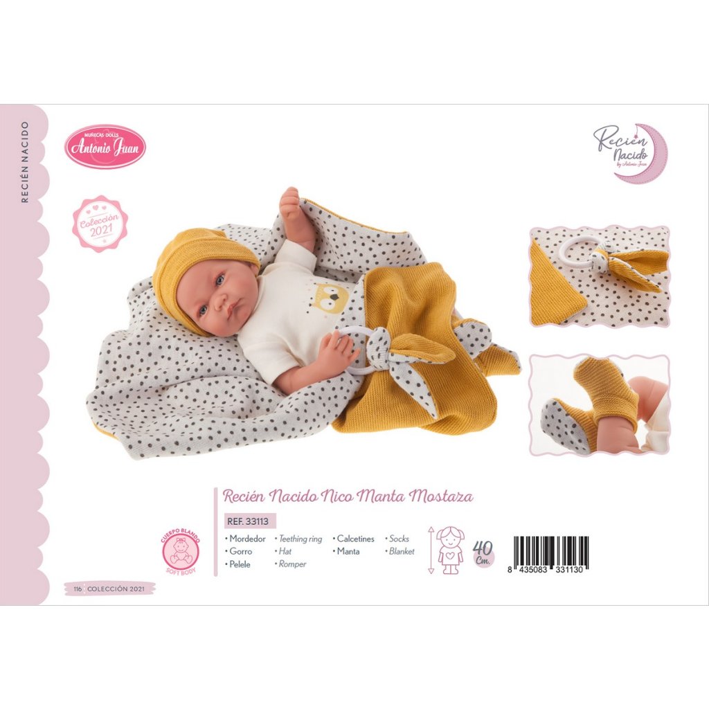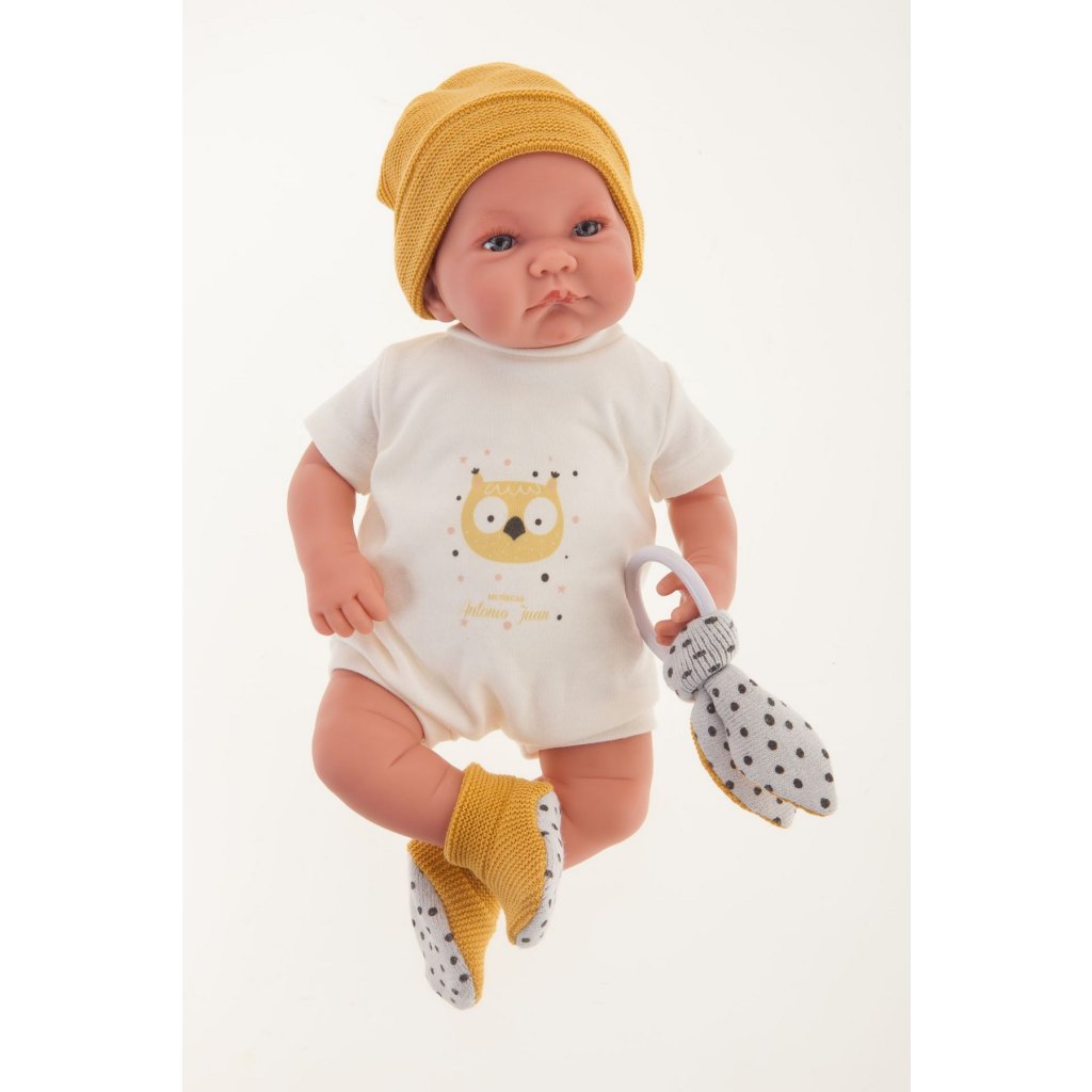 Ručně vyrobená realistická španělská panenka - miminko s realistickými prvky v obličeji a na končetinách. Ruce a nohy jsou k tělu přichycené kloubem s možností polohování, což miminku umožňuje třeba i samostatné sezení bez opory. Panenka má měkké látkové tělo, hlava a končetiny jsou vyrobené ze speciálního měkčeného vinylu, příjemného na dotek. Oblečení panenky bylo vyrobeno z organické bavlny, která zaručuje výrobu z ručně sbírané, ekologicky bez chemického ošetření pěstované bavlny. Firma Antonio Juan klade velký důraz na ekologii a proto jako první využívá v tomto odvětví zmíněnou bavlnu.