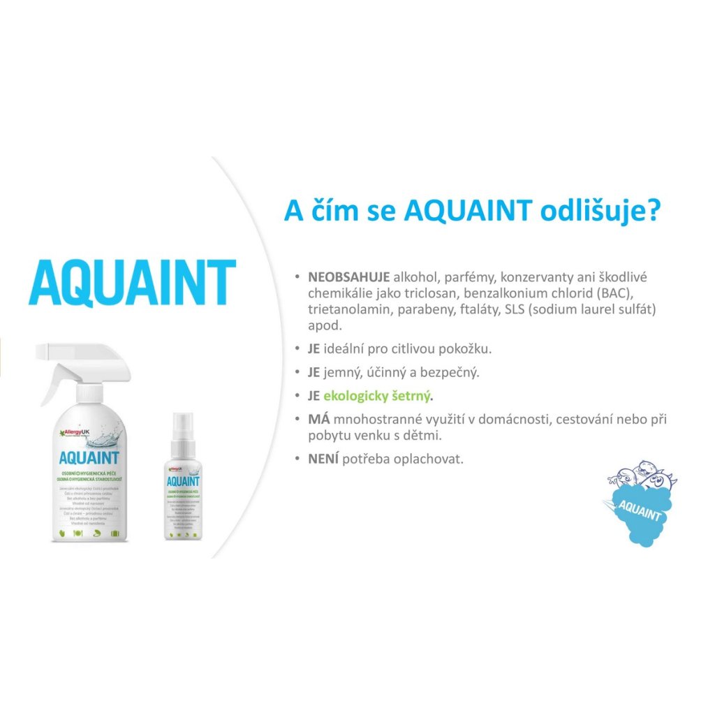 Aquaint je bezpečná, přirozená dezinfekční voda šetrná jak k dětem, tak k životnímu prostředí. Je přirozená, protože jejími jedinými složkami jsou voda a přírodní kyselina (kyselina chlorná HCIO), kterou vytváří lidské tělo pro boj s bakteriemi. Za pár sekund dokáže zlikvidovat 99,9 % bakterií. Aquaint je dermatologicky a klinicky testována, vhodná pro citlivou pokožku a při požití neškodná. Neobsahuje alkohol, konzervanty, parabeny ani ftaláty. Je bez chuti a zápachu. Netřeba ji oplachovat.