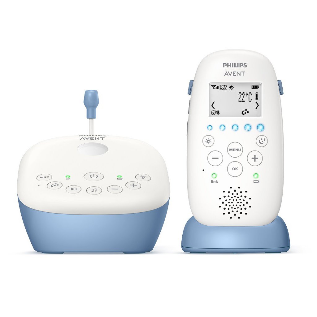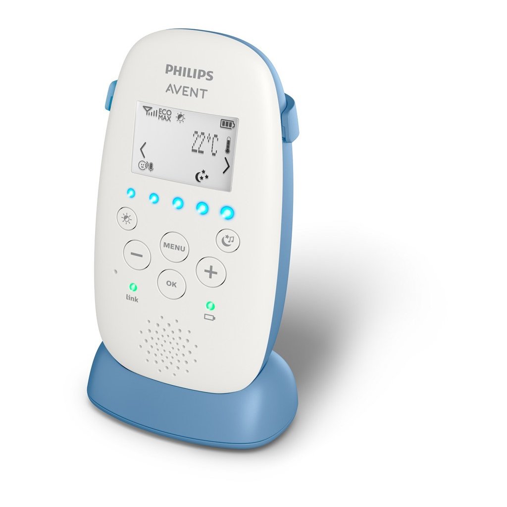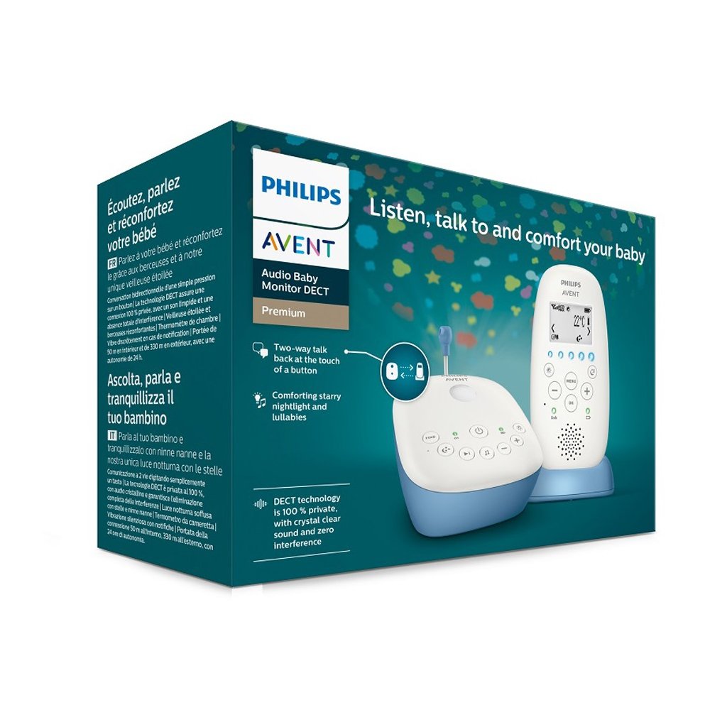 Jistota a pohoda pro vás a vaše dítě. Tato elektronická chůva Philips AVENT zaručuje maximální pohodlí a pocit bezpečí pro vás i vaše dítě. Nabízí vysoce spolehlivé spojení a řadu funkcí k uklidnění dítěte. Navíc promítá noční světlo s hvězdami, které si vaše dítě určitě zamiluje! S novou řadou monitorů DECT Philips AVENT můžete v klidu odpočívat s vědomím, že je vaše dítě spokojené, i když s ním nejste v místnosti. Nová řada monitorů DECT poskytuje množství neocenitelných vlastností. Digitální technologie vás upozorní i na nejtišší šepot a umožní vám uklidnit vaše dítě díky spojení s garancí nulového rušení v domě a v jeho okolí.