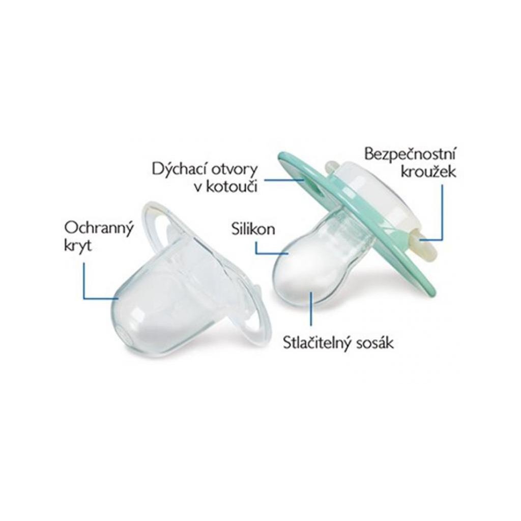 Savička je vyrobena z lékařského silikonu, který je chuťově neutrální a bez zápachu. Dudlík je pevný a odolný a časem nemění tvar ani baru. Šidítko lze sterilizovat i mýt v myčce. Součástí balení je i zaklapávací ochranný kryt pro právě sterilizované dudlíky.