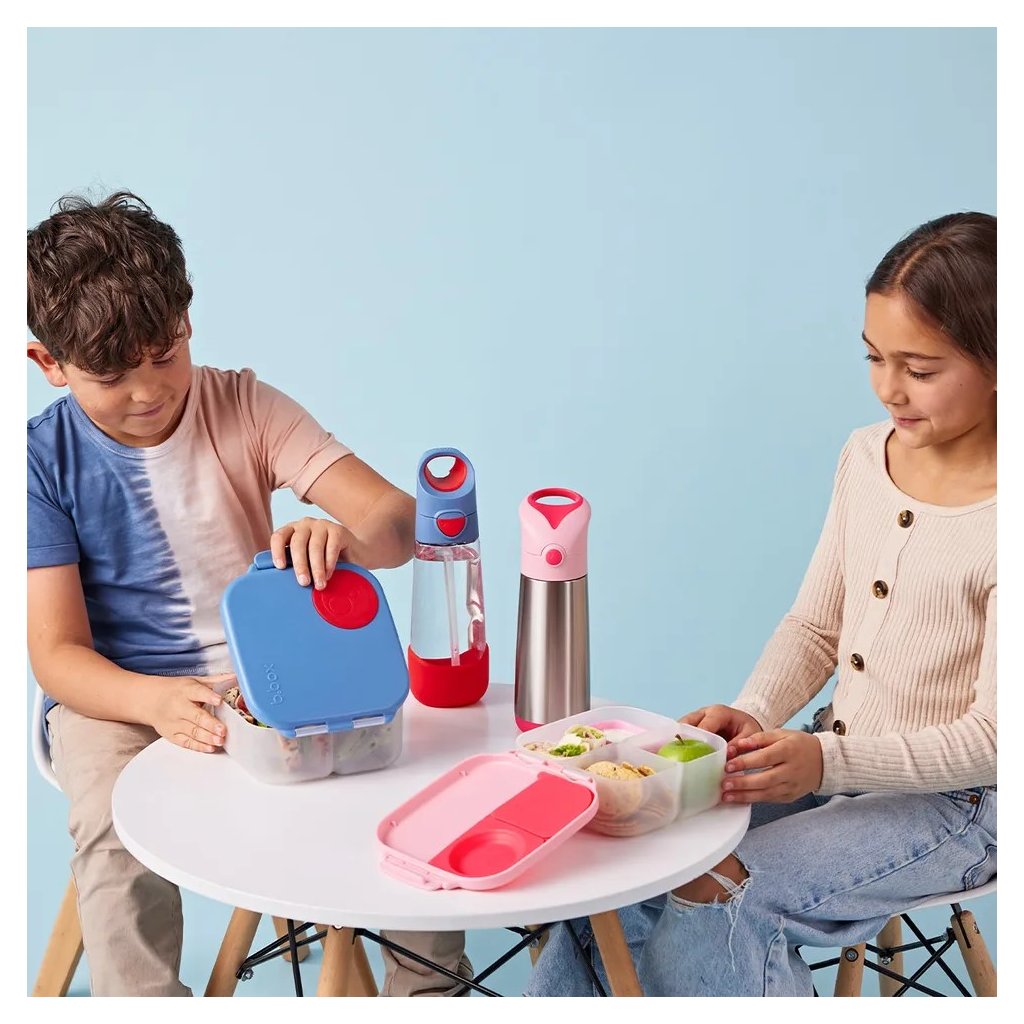 Už jsou velcí na hrníček s brčkem a malá lahvička nezažene jejich žízeň? B.box má pro ně bezvadnou lahvičku! Do školky i do školy, na hřiště i na výlety, tritanovou lahvičku můžete mít všude sebou. Potěší jak děti tak rodiče. Silikonové brčko dovolí vypít z lahvičky i tu poslední kapku a víčko má držátko pro snadné nošení nebo zavěšení na batoh, kočárek apod. Lahvička se po snadném zmáčknutí "tlačítka" lehce otevře. Brčko lahvičky je pevné, kolmé ke dnu lahvičky. Pítko (horní část brčka) je cca 5mm od konce opatřeno "ventilkem", který zabraňuje samovolnému vytékání tekutiny. Při pití je nutné brčko lehce sevřít mezi jazykem a patrem nebo rty či zuby. Lahvička je určena pro pití ve svislé poloze, dnem dolů.