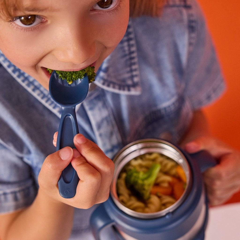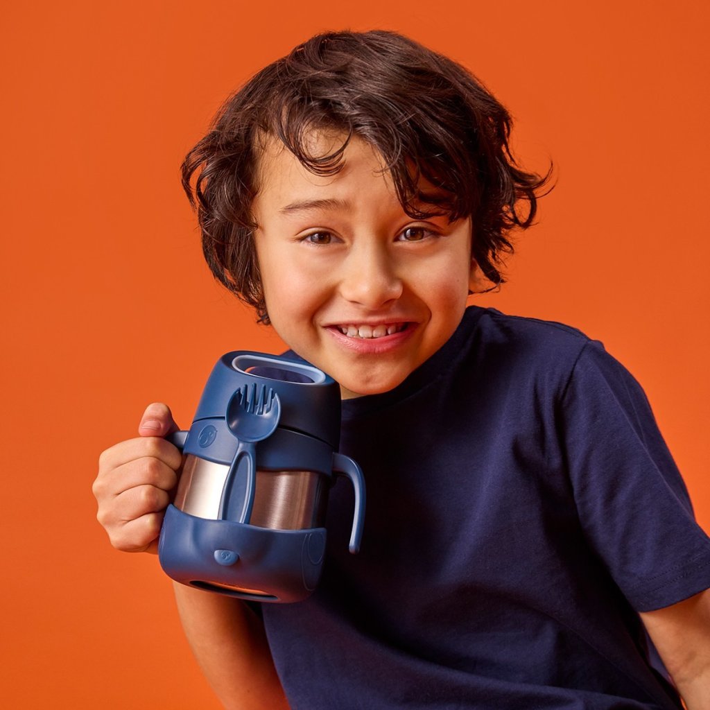 Široká termoska, aby malé ručičky dosáhly na poslední sousto na dně. Ouška i spodní kryt jsou odnímatelné, hodí se tedy i pro velké děti.