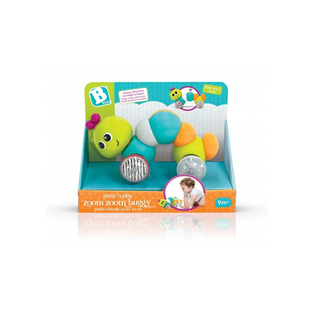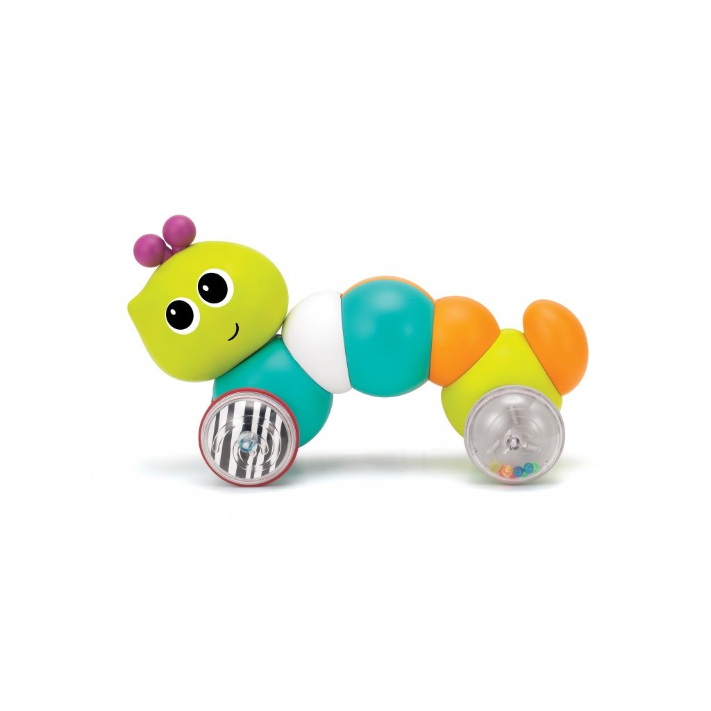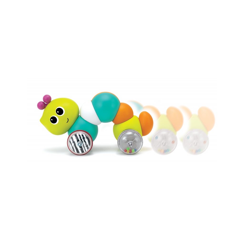 Veselá stonožka na kolečkách se pohybuje zmáčknutím pružného těla směrem dolů. Hračka při pohybu chrastí. Výrazné barvy a usměvavý obličej upoutávají pozornost dítěte. Hračka podporuje rozvoj smyslů a motoriky dítěte. Vhodné od 9 měsíců.