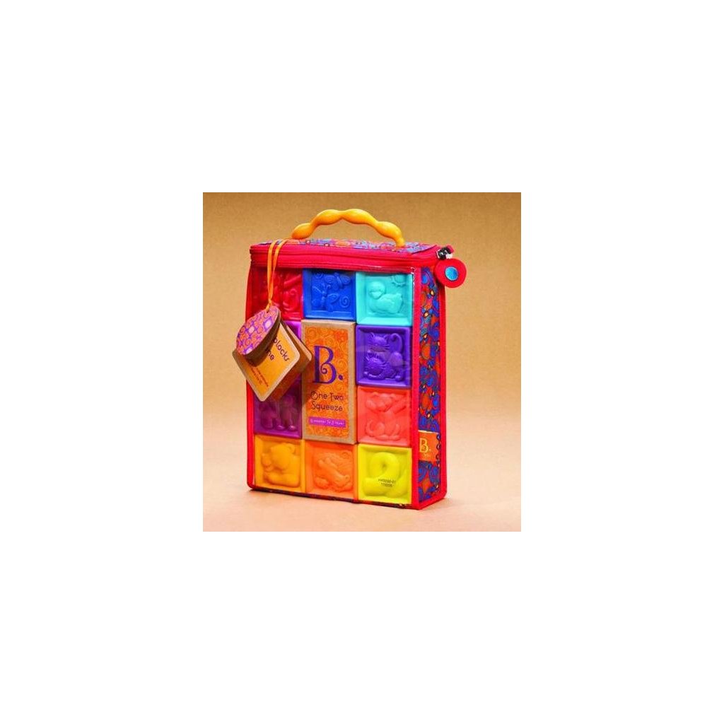 Tato hračka obsahuje 10 různobarevných kostek s písmeny a zvířátky. Jsou vyrobeny z měkkého plastového materiálu a po zmáčknutí pískají. Dítě může z kostek stavět, házet s nimi nebo se z nich učit písmenka a názvy zvířátek. Hračka podporuje u dítěte kreativitu a jemnou motoriku. Zábavnou formou se tak při hraní zároveň učí. Hračka je vhodná pro děti od 6 měsíců do 3 let.