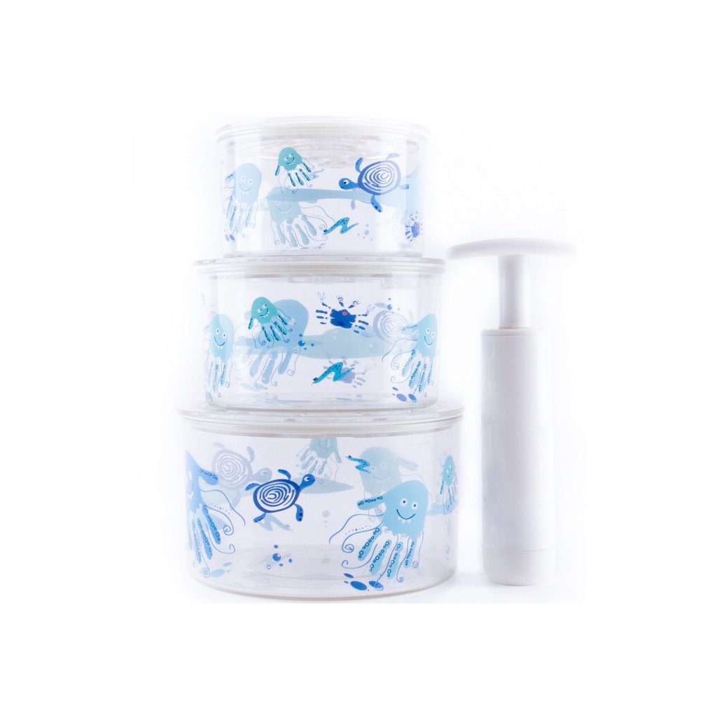 Baby Monsters sada 3 vakuových krabiček Tup Air, set obsahuje 3 x krabičku, pumpu, 3 x těsnící kryt s ventilkem a ukazatelem tlaku. Sada vakuových krabiček Baby Monsters Tup Air udrží vaše jídlo déle čerstvé, je ideální na cesty. Set je jednoduchý na údržbu, odolný proti vlhkosti, antioxidační, antibakteriální. Před prvním použitím výrobek zkontrolujte a řádně omyjte v teplé vodě.