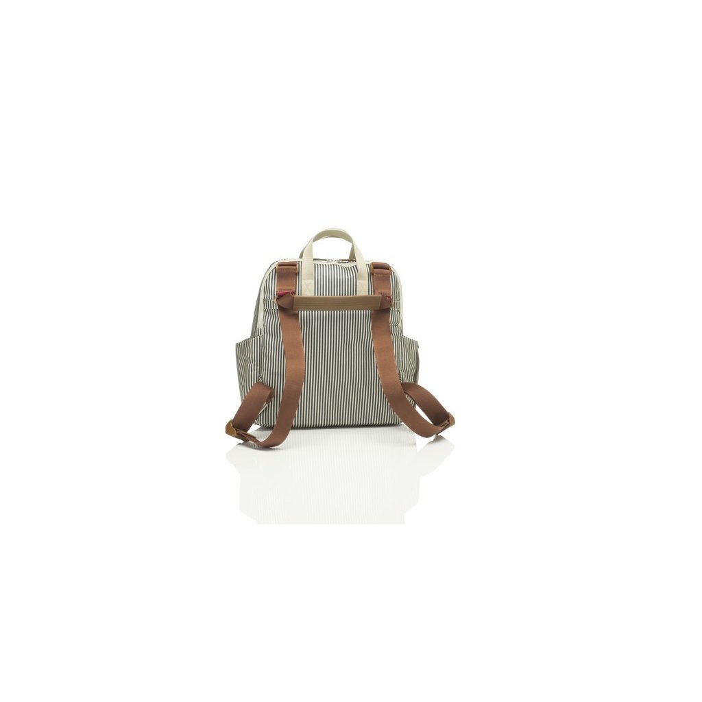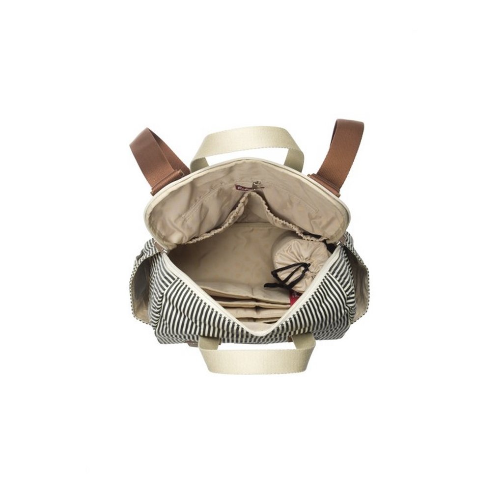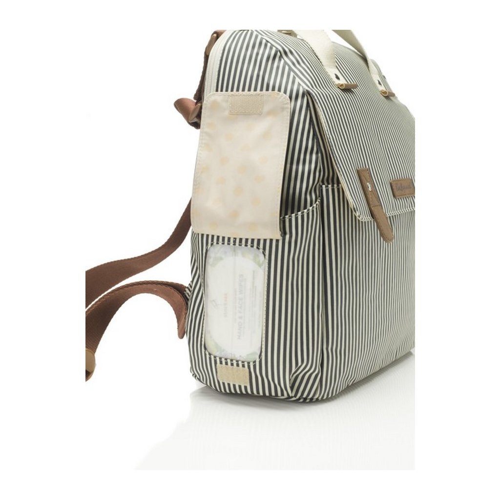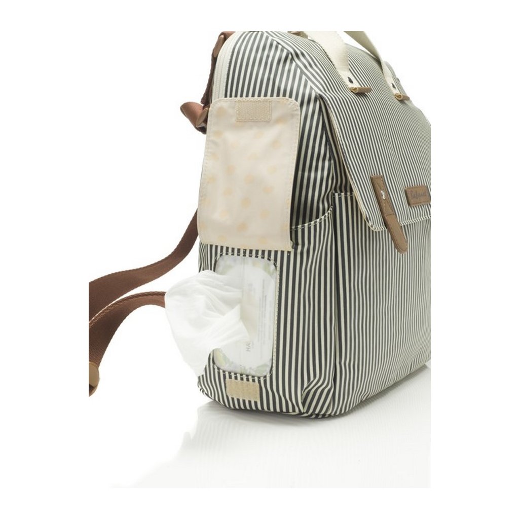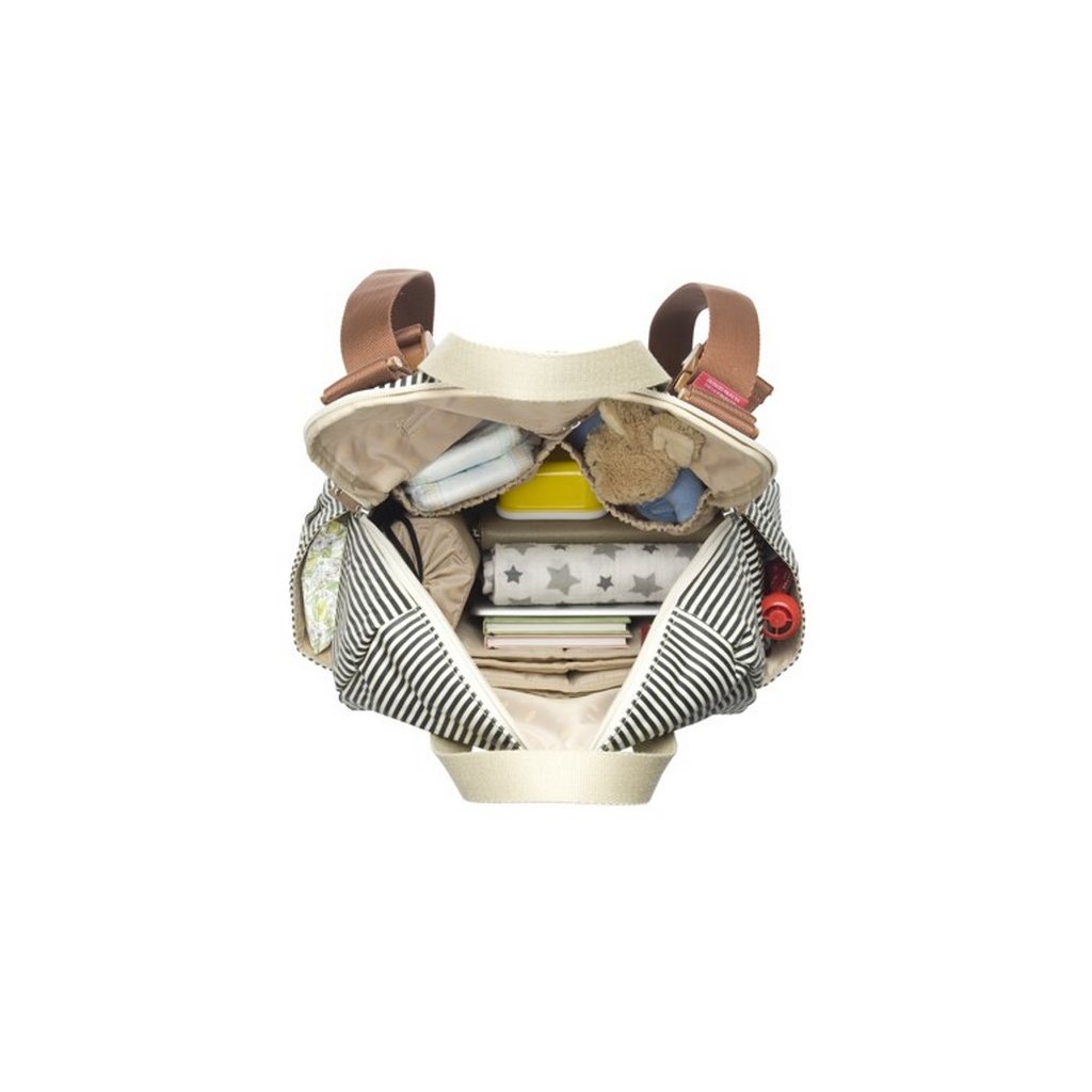 Je vybavena 3 vnitřními kapsami z toho 1 na zip, termo obalem na láhev, přebalovací podložkou a 3 vnějšími kapsami, včetně 1 velké přední s magnetickým uzavíráním. Boční kapsa je vybavena speciální přihrádkou na vlhčené ubrousky. Tuto tašku ke kočárku můžete nosit za horní úchyty, přes rameno – cross body nebo jako batůžek. Součástí ramenního popruhu je patentovaný úchyt, který umožňuje přebalovací tašku bezpečně uchytit ke kočárku.