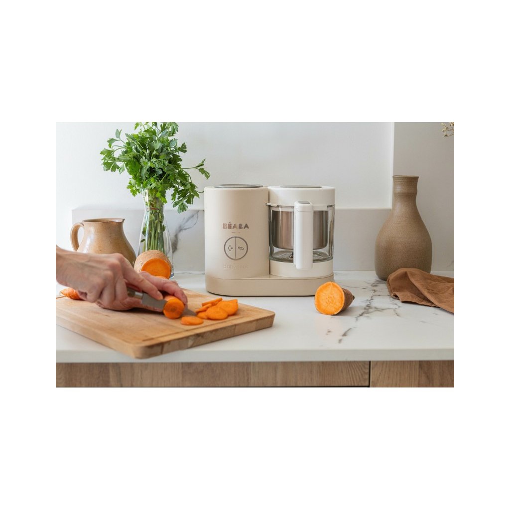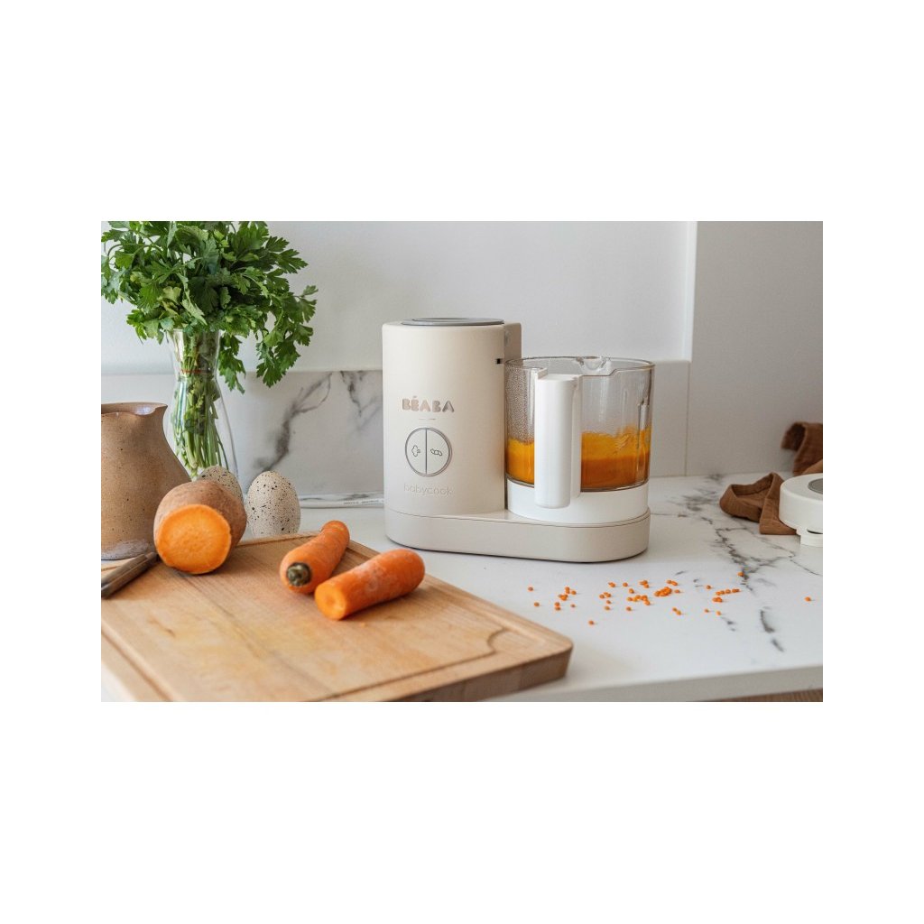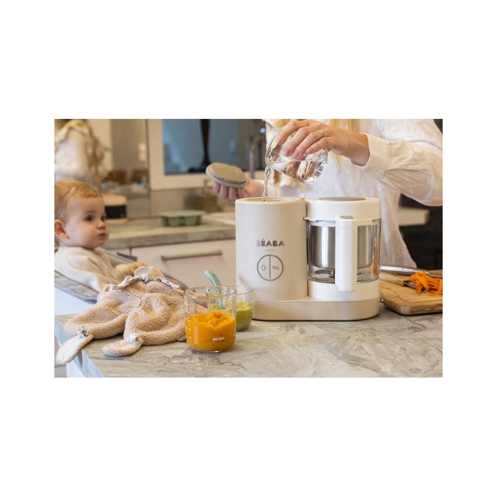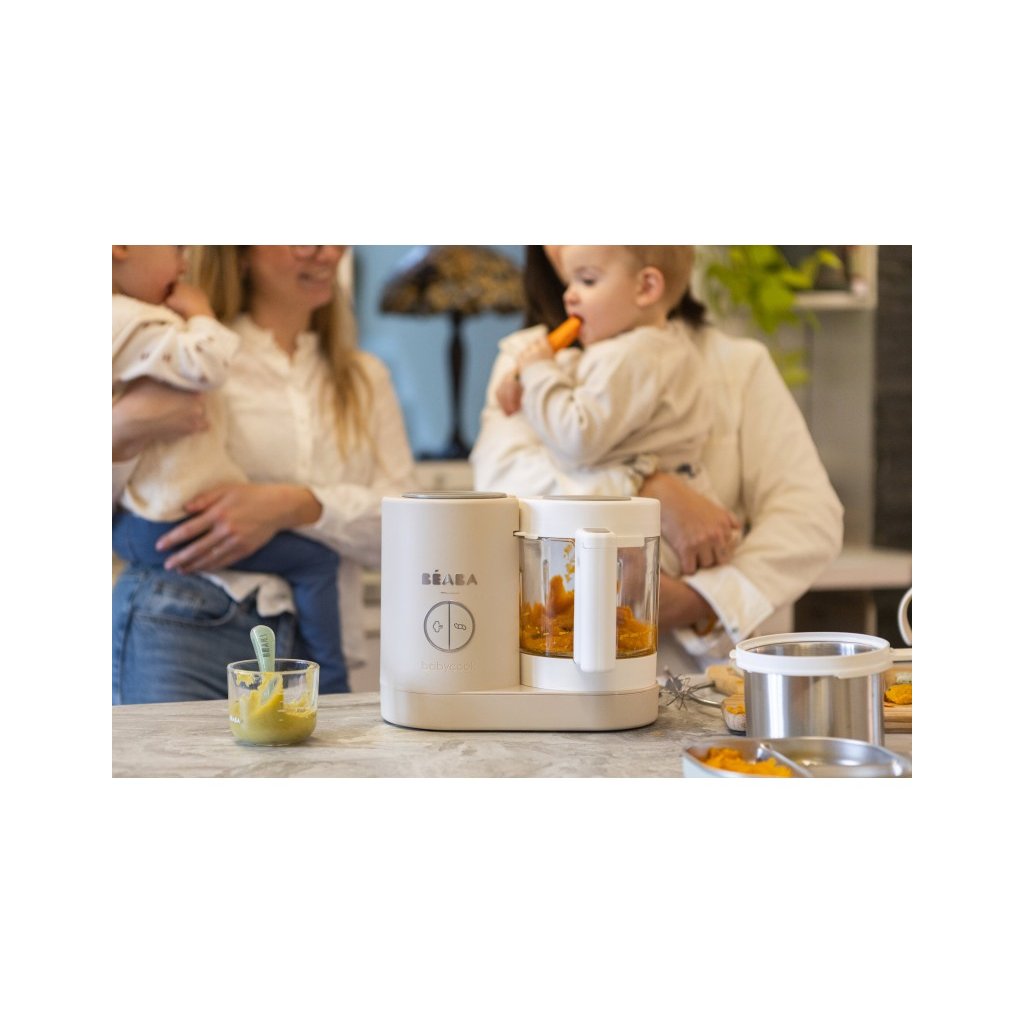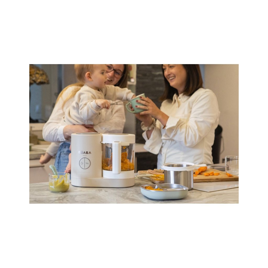 Skvělou pomoc při přípravě pokrmů pro děti představuje parní hrnec a mixér v jednom Babycook® Beaba. Babycook® umožňuje zdravě uvařit pokrm v páře a následně ho ve stejné nádobě rozmixovat. Zcela nový model Babycook® NEO má skleněnou nádobu s objemem 1250 ml a nerezový vkládací košík s objemem 1000 ml. Nerezový zásobník na vodu s vnitřní ryskou a se širokým vstupním otvorem usnadňuje plnění vodou i čištění zásobníku. Přístroj je možné použít i pro rozmrazování a ohřívání dětské stravy. Barva je šedá.