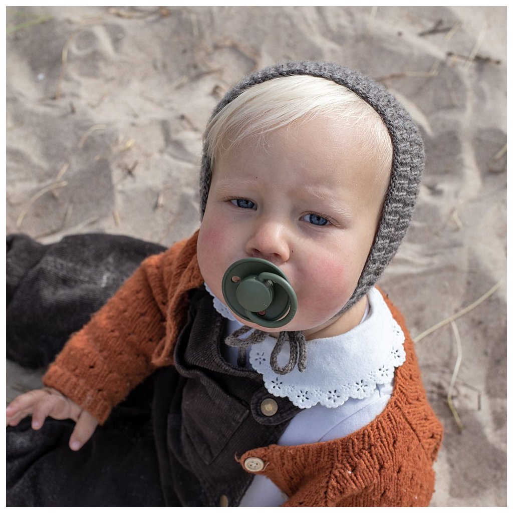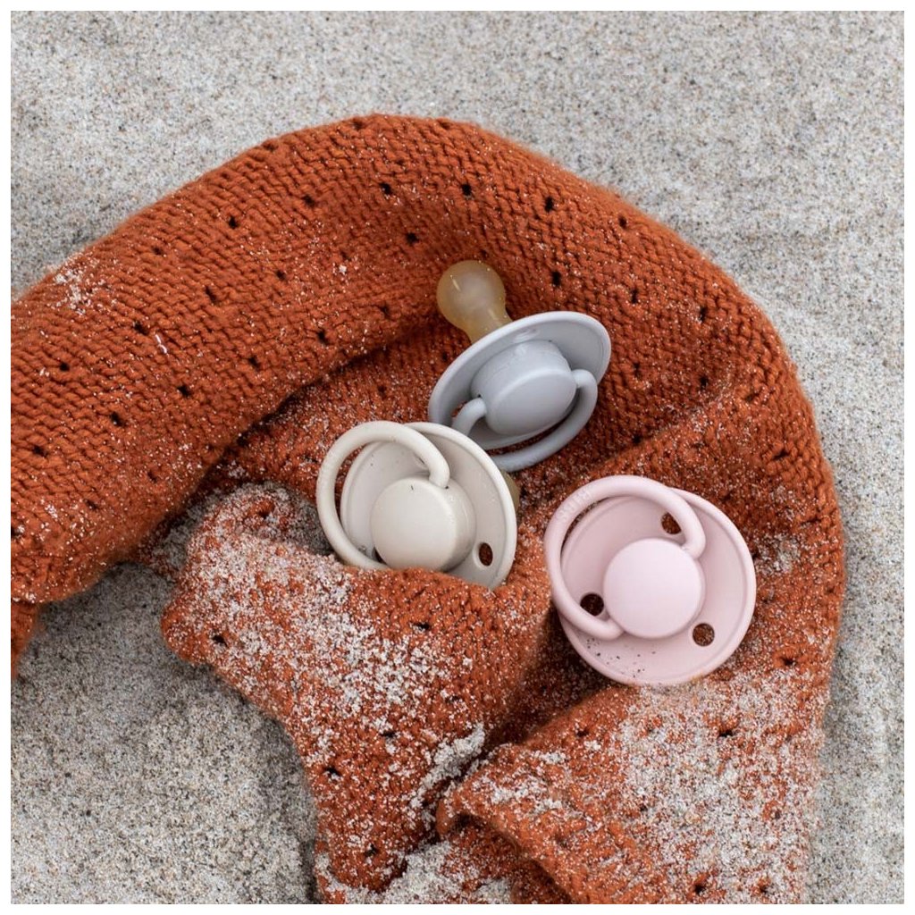 BIBS De Lux je klasický kulatý dudlík s minimalistickým vzhledem a moderním matným povrchem v krásné barevné nabídce jemných, pastelových, zemitých i neutrálních tónů. Sací část je vyrobená ze 100% přírodního kaučuku, který je mimořádně pružný a měkký zároveň, odolný proti vytvoření trhlin a odštěpení malých kousků. Ostatní části (kotouč a karička) jsou vyrobeny ze zdravotně nezávadného polypropylenu (PP). Dudlík je navržen tak, aby nedráždil citlivou pokožku miminka. Kulatý kroužek s větracími otvory má klenutý tvar, téměř vůbec se nedotýká pokožky kolem úst, ta proto zůstává klidná, bez otisků a podráždění. Díky měkoučkému kaučuku a zabudovanému vzduchovému ventilu dítě dudlík snadno stlačuje a formuje v ústech, čímž je zachován přirozený vývin patra, zoubků a dásní dětí. Upozornění: Dudlíky se používáním natahují (mění velikost i barvu)!!