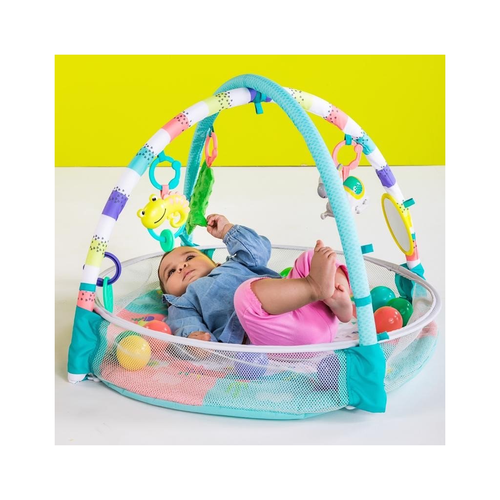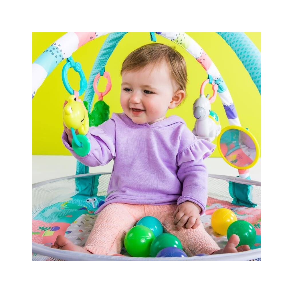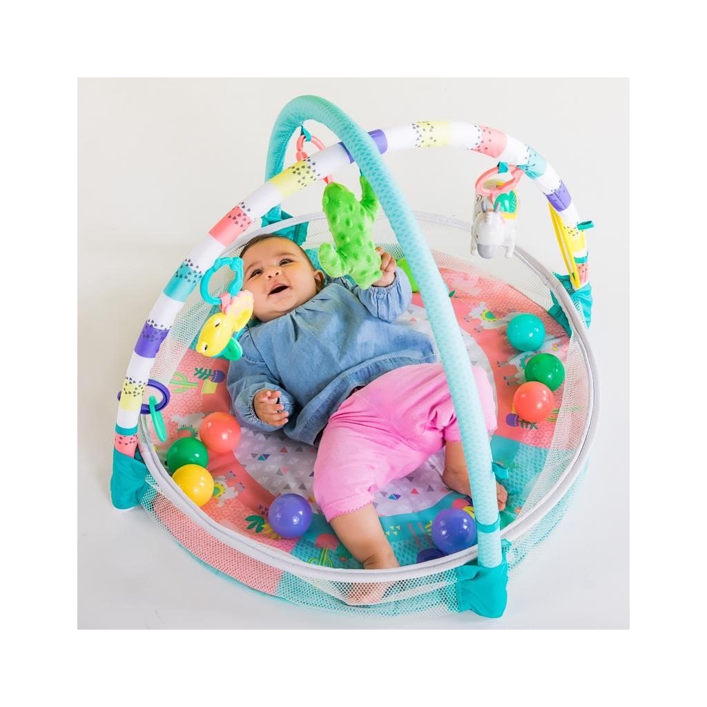 Hravé místo, které dopřeje Vašemu děťátku zábavu a spoustu her podporujících jeho rozvoj a stimulaci smyslů. Od cvičení během her na bříšku až po skotačení s míčky. Funkce 4v1 Vám poskytuje vícenásobné využití deky postupně jako děťátko roste. Síťové stěny deky se dají nastavit nahoru nebo dolů, stěny působí jako bariéra během hry i hry na bříšku a pomáhají udržet barevné míčky vždy po ruce a na dosah pro děťátko. Součástí je i bezpečnostní zrcátko, které podporuje u děťátka sebepoznávání. Hračky jsou přizpůsobeny i pro přenášení a můžete je připojit k většině autosedaček a kočárků. Okouzlí Vás i krásný design deky plný pestrých barev. Deka se snadno udržuje v čistotě a lze ji prát v pračce. Odnímatelné hrazdičky umožní deku jednoduše složit a uskladnit, tak aby nezabírala velký prostor.
