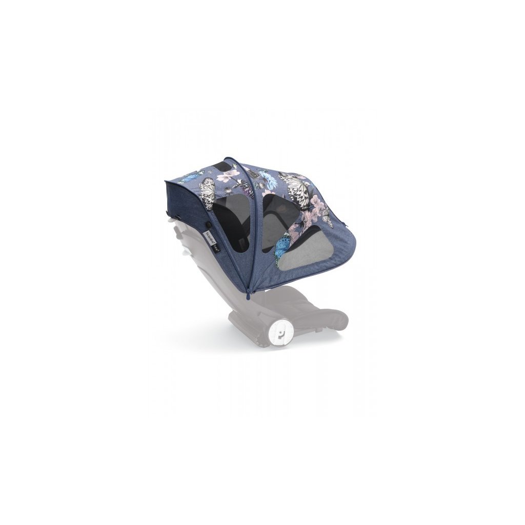 Multifunkční stříška s větracími okénky pro kočárek Bugaboo Bee5 a Bee3 poskytne dítěti ochranu před slunečními paprsky a zároveň mu díky větracím okénkům dopřeje čistý vzduch a zabrání tak jeho přehřátí. V chladnějších měsících pak poskytuje dostatečnou ochranu před nepříznivým počasím. Vysoce kvalitní materiál stříšky je vybaven ochranným filtrem UPF 50+ a je voděodolný. Prodyšné otvory jsou vyrobeny z jemné síťoviny, která napomáhá optimální cirkulaci vzduchu. Stříška je nastavitelná, díky čemuž zaručuje dokonalé zastínění. Spodní část lze rozepnout a vysunout moskytiéru. Stříška má modrou melírovanou barvu s motivem květin a motýlů.