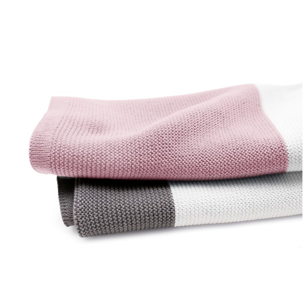 Tato stylová pletená deka je vyrobena ze 100% přírodní bavlny, která má výborné termoregulační schopnosti a je citlivá i k té nejjemnější pokožce. Díky jemnému úpletu je deka velmi prodyšná, a tak je vhodná i pro teplejší dny. Velikost deky je 80 x 100 cm. Lze ji prát na 30 °C. Deka má odstíny bílé, šedé a světle růžové.