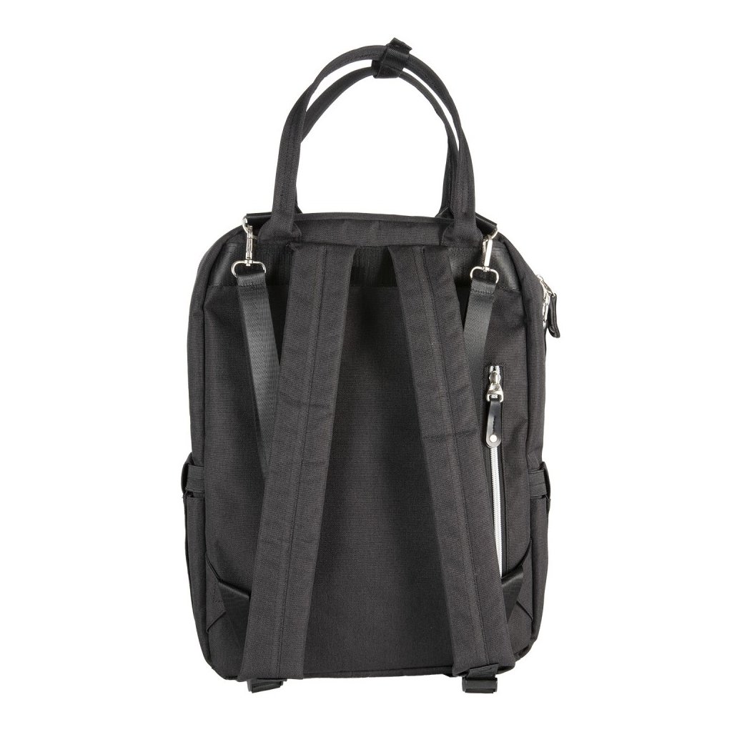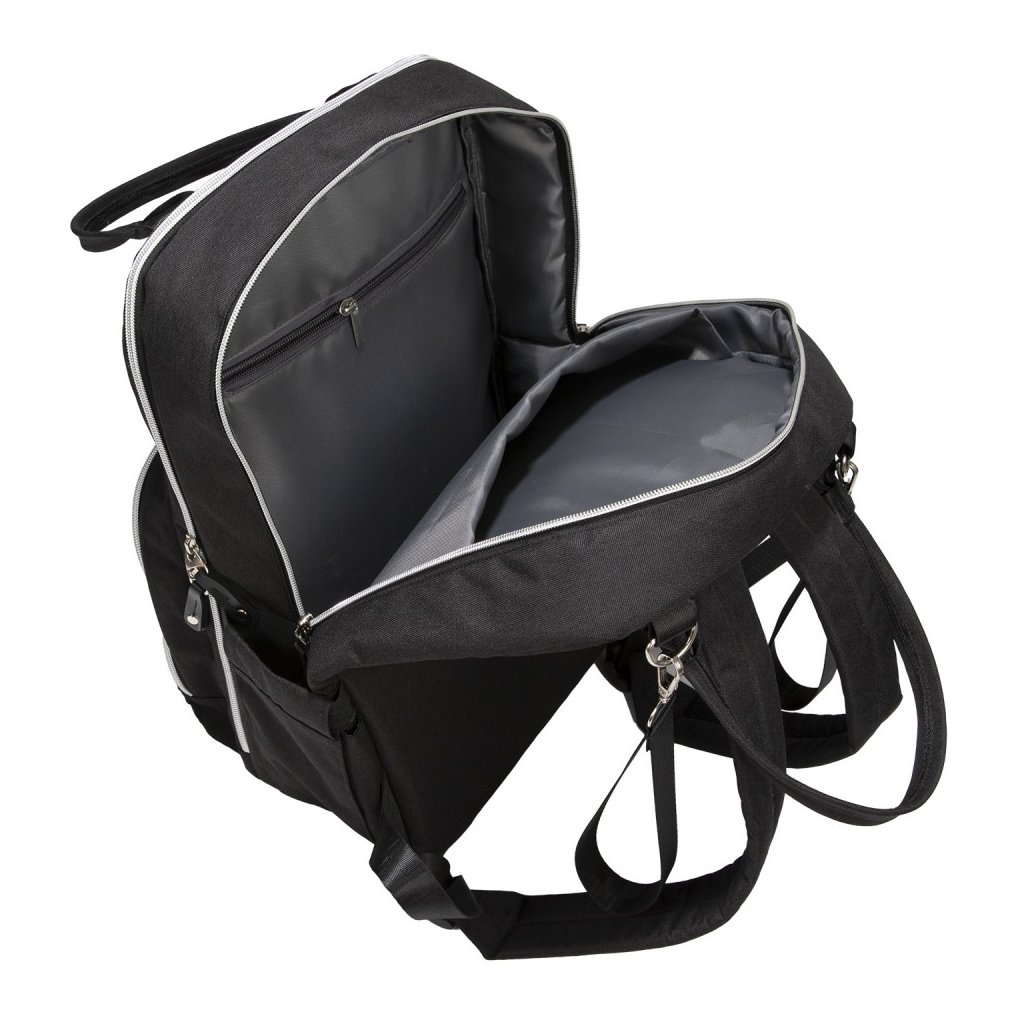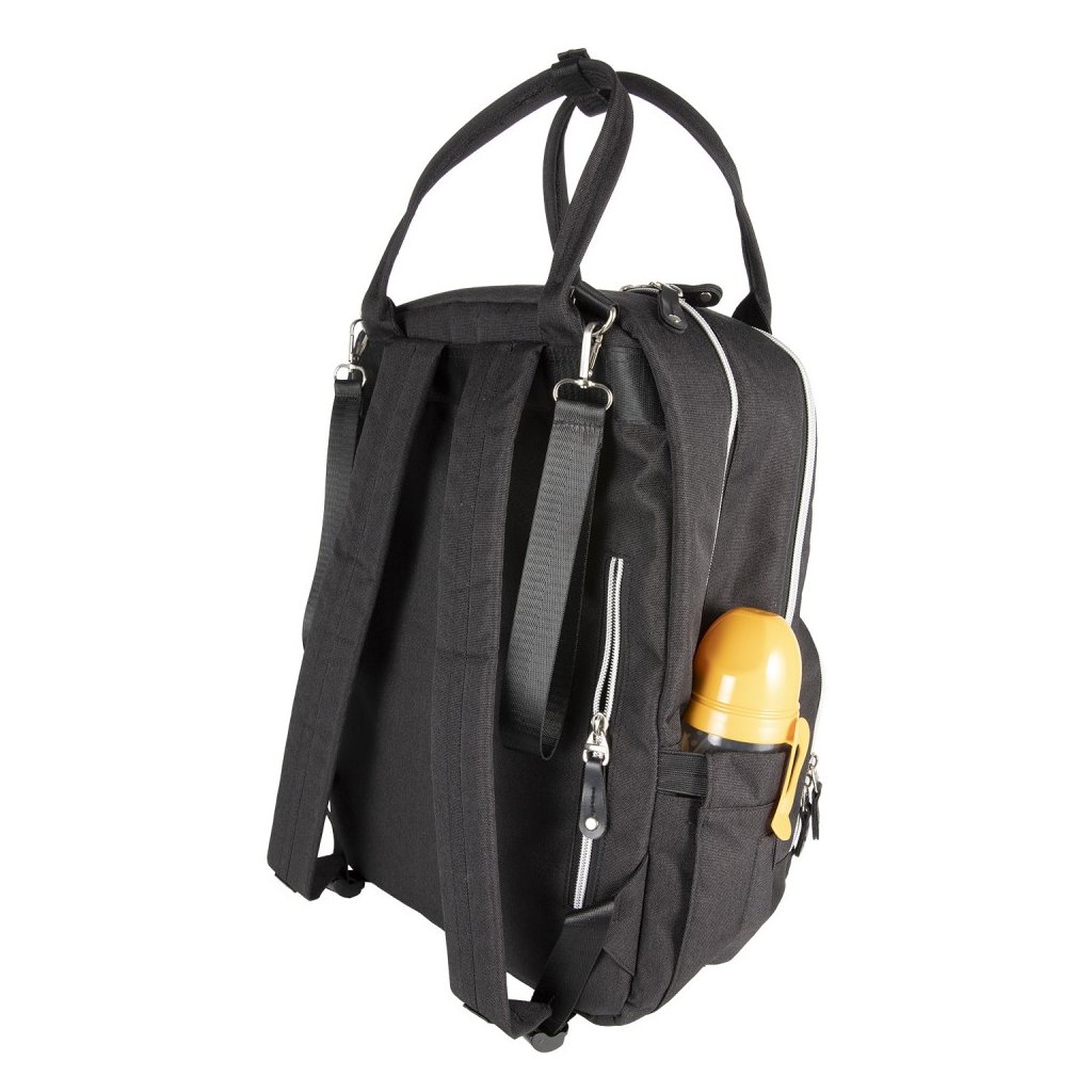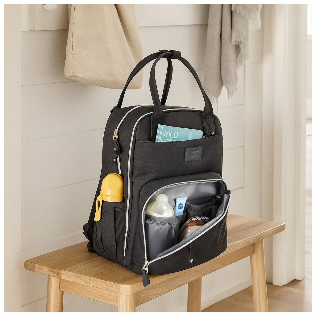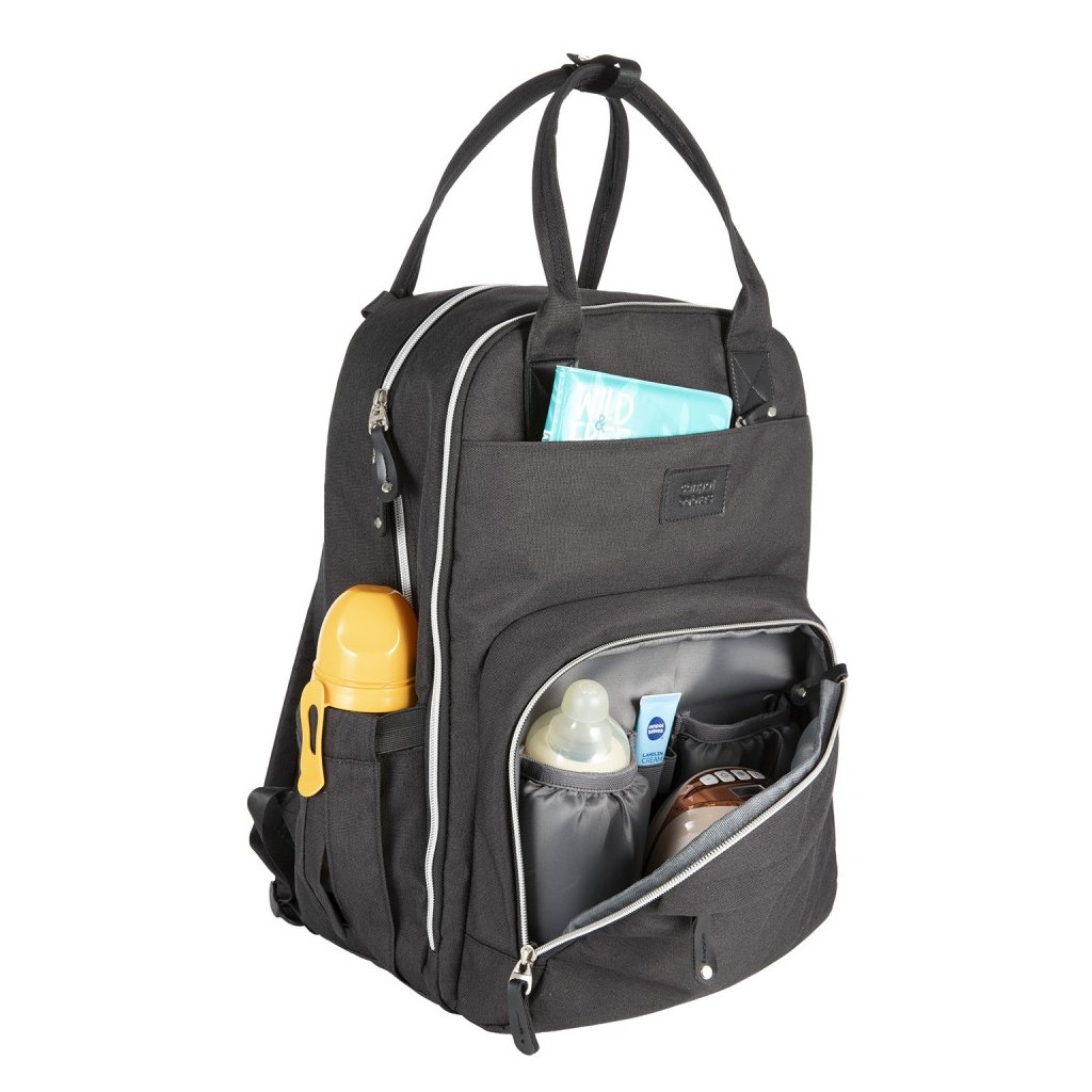 - dvě praktické boční kapsy - jedna přímo určená pro navlhčené ubrousky s manipulačním otvorem, druhá na hrnek či lahev – kapsy umožňují snadný přístup bez nutnosti otevírání hlavní kapsy