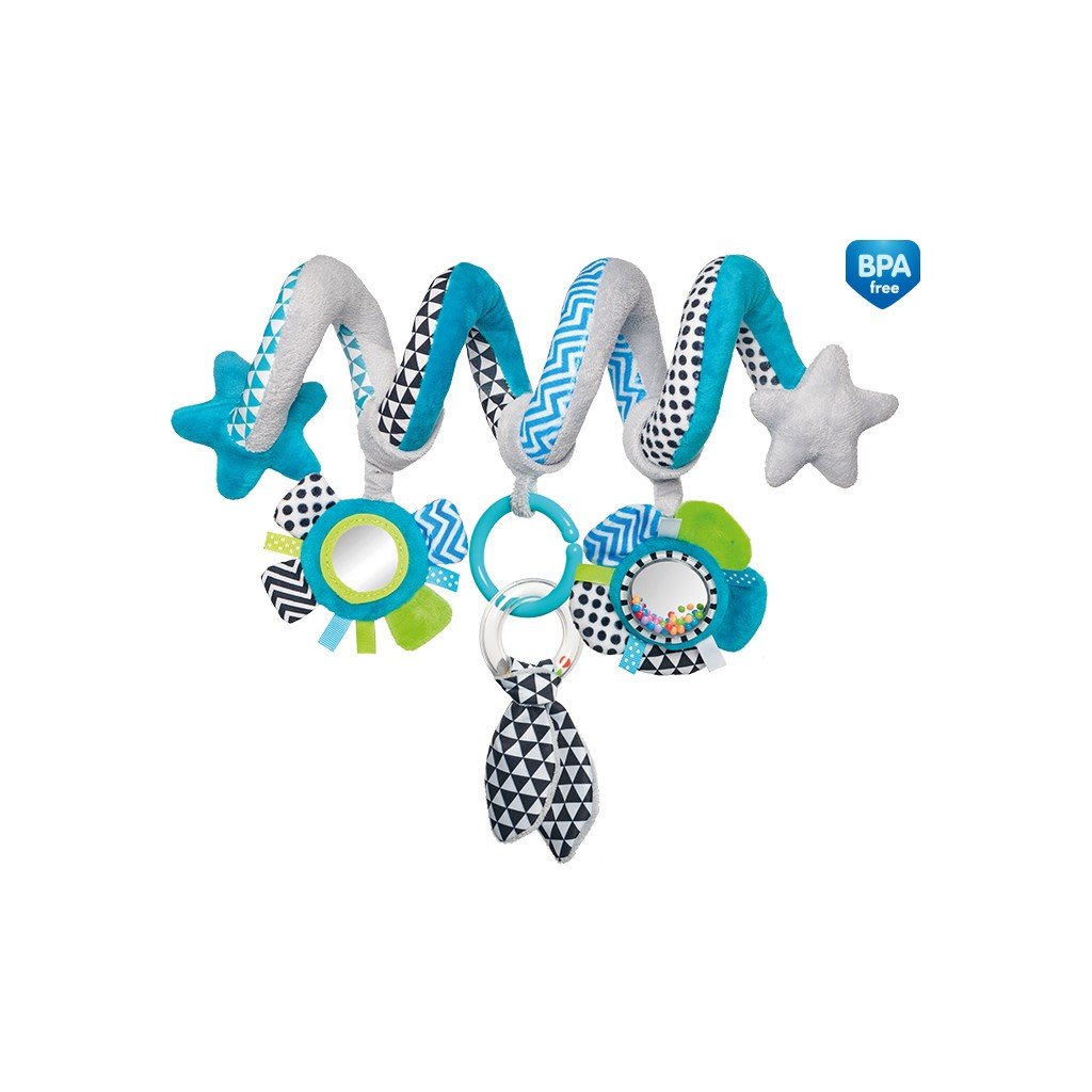 Plyšová spirála do kočárku nebo do postýlky podporuje rozvoj smyslů a motoriky dítěte. Atraktivní tvary a intenzivní barvy přitahují pozornost dítěte. Plyšové figurky a kroužky jsou lehké a příjemné na dotek.