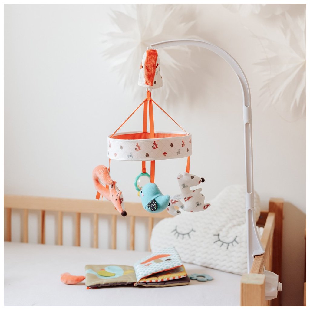 Kolotoč nad dětskou postýlku s melodií z kolekce FOX podporuje vývoj miminka od prvních dnů života - skvěle stimuluje zrakovou, sluchovou a pohybovou koordinaci dítěte. Barevné hračky přitahují pozornost miminka a podporují rozvoj zraku. Pěkné a klidné zvuky a melodie vaše miminko uklidní a usnadní usínání. Tento plyšový kolotoč nad postýlku má pohodlnou rukojeť, díky které jej lze snadno a stabilně připevnit. Kolotoč nevyžaduje baterie, protože motorek se navíjí ručně. Každá hračka má pro dítě jinou atrakci: šustící prvky, pískot nebo chrastítko. Kolotoč je určen pro děti, které se ještě neumí samostatně pohybovat. Kolotoč nelze prát v pračce ani dezinfikovat párou. V případě znečištění otřete kolotoč vlhkým hadříkem.