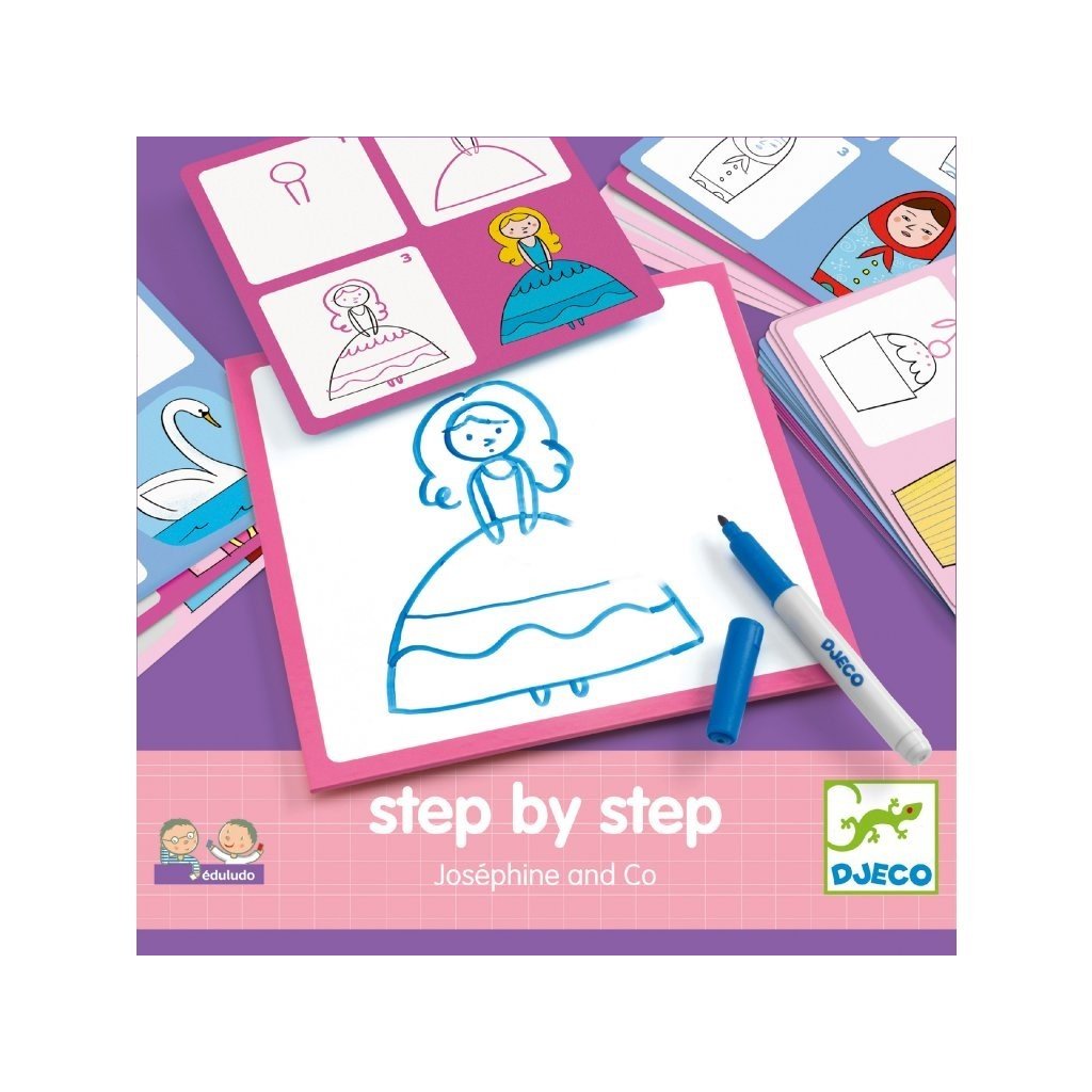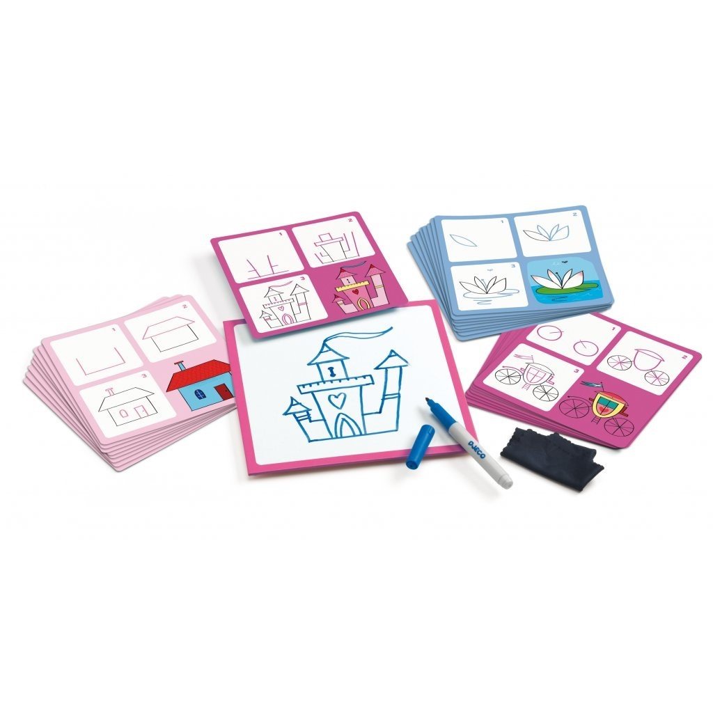 Kreslící sada Krok za krokem s mazací tabulkou a návody. Sada 30 návodů a tří mazacích tabulek, smývatelná fixa a čistící houbička. Děti kreslí jednoduchými tahy podle návodů obrázky.