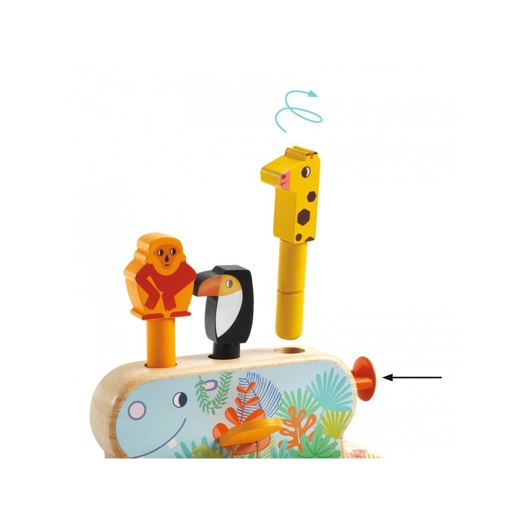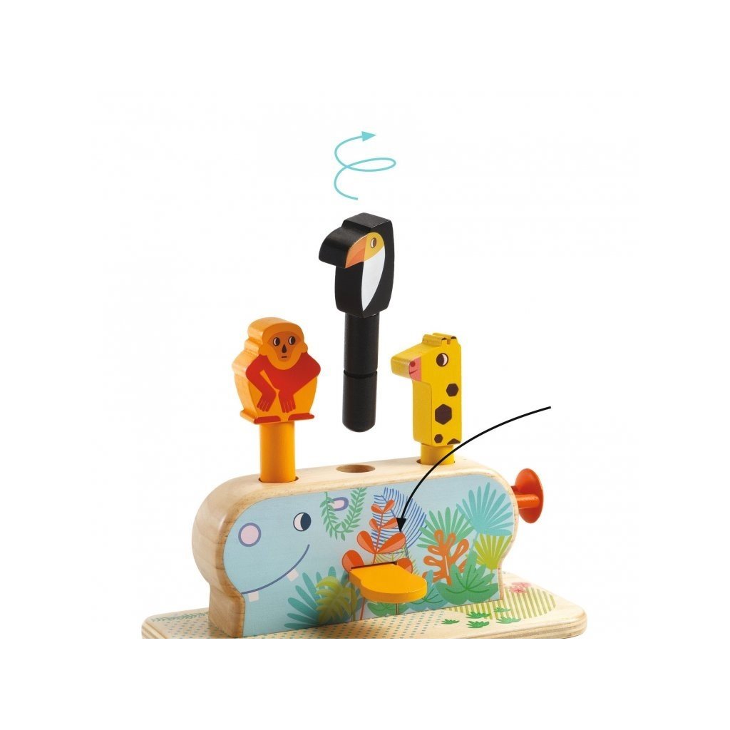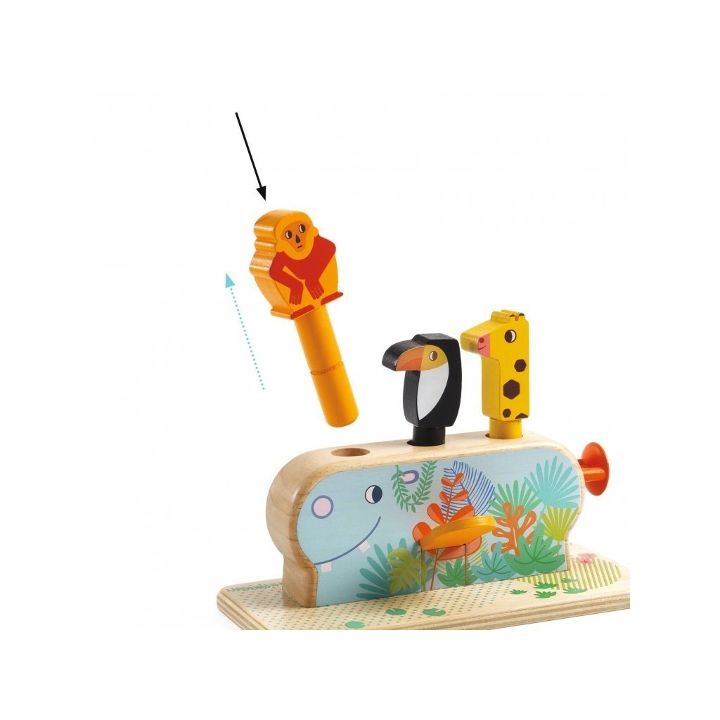 Multi Pop je dřevěná hračka, kde děti mohou objevit 3 různé způsoby, jak přimět zvířátka skákat. Zatlačte na opici, aby vyskočila, stiskněte páku, aby tukan vyskočil, a stiskněte tlačítko, aby žirafa vyskočila.