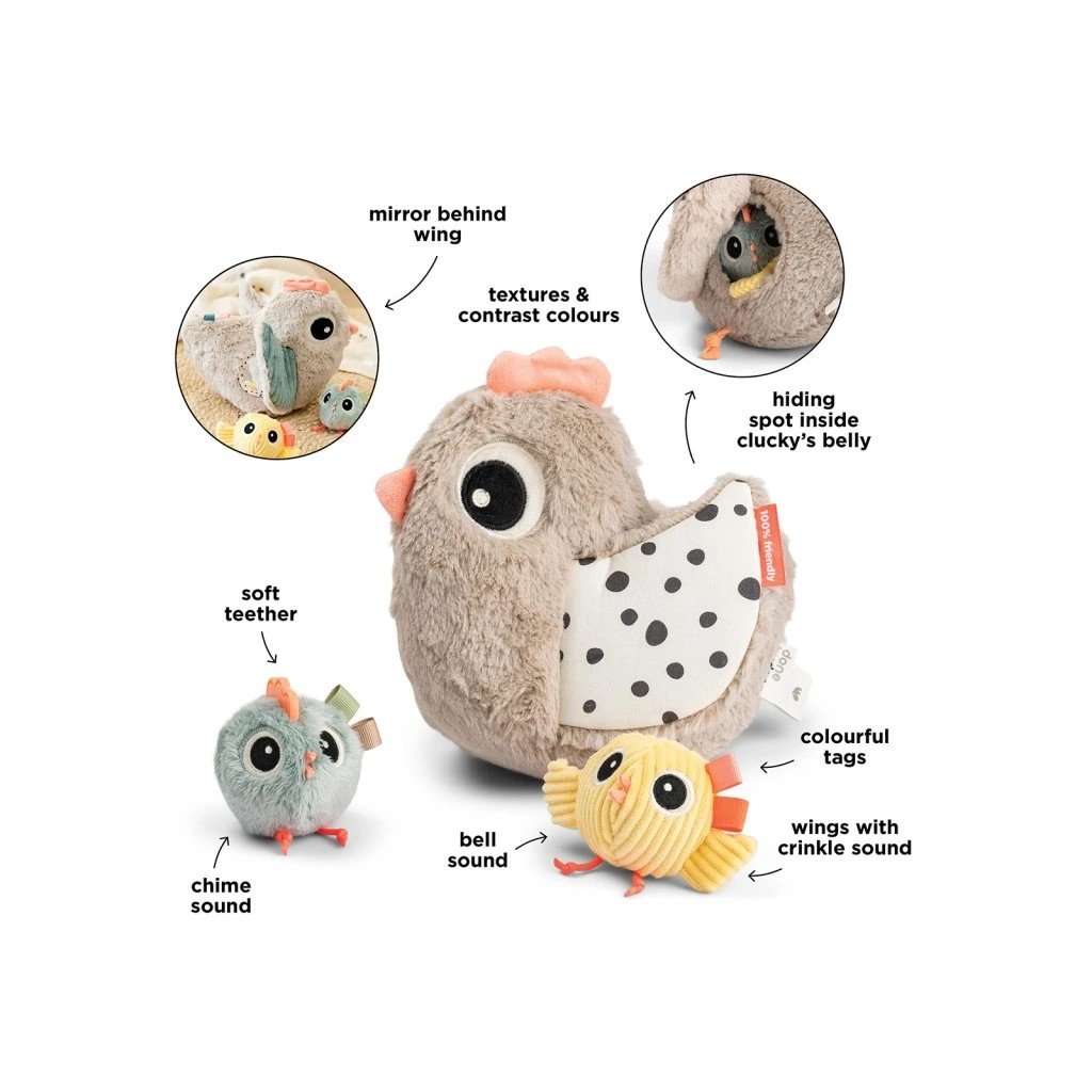 Plyšová slepička je zábavná a vzdělávací hračka pro miminka a batolata. Užijte si mnoho smyslových aktivit a stimulačních funkcí a v jemných barvách. Hračka podporuje zvědavost a koordinaci. Ideální pro malé ručičky. Pod křidýlkem najdete zrcátko a malá kuřátka chrastí.