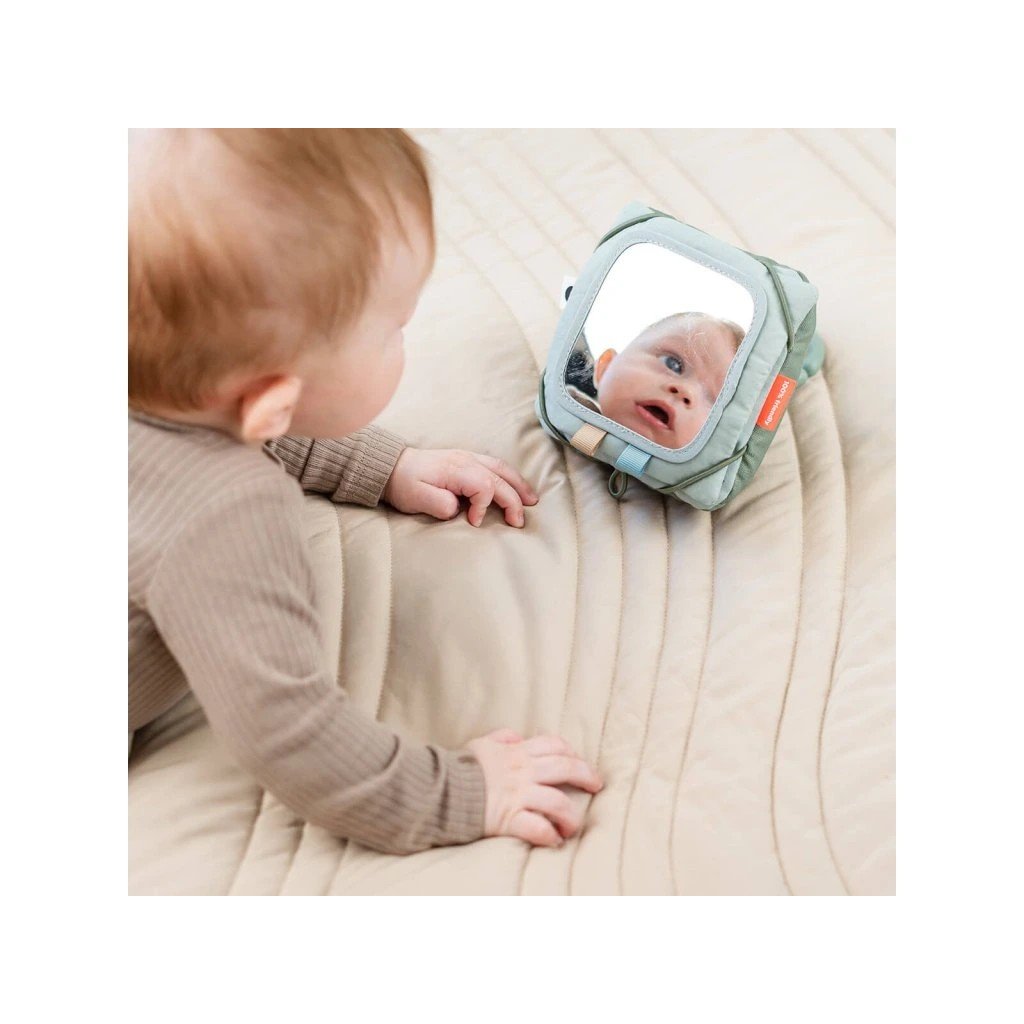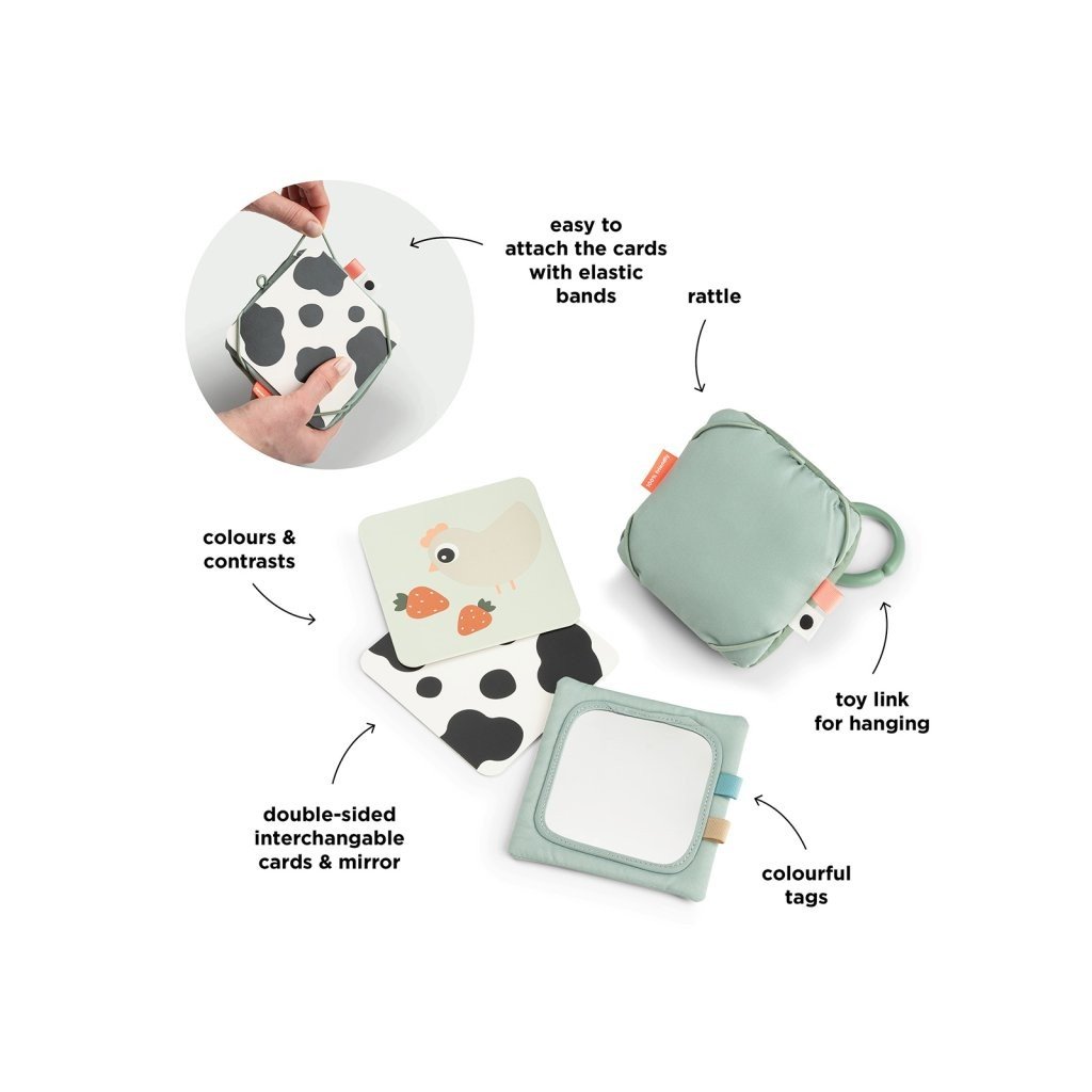 Měkký textilní držák na vyměnitelné obrázky. Doporučeno od 0 měsíců. Ideální pro rozvoj zraku vašeho dítěte. Přizpůsobte si jej přidáním vlastního obrázku nebo kresby do držáku. Dodává se se zrcátkem a dvěma oboustrannými kontrastními kartami. Zavěste ho na hrazdičku nebo podložku na hraní nebo ho položte na podlahu a procvičte si polohu na bříšku.