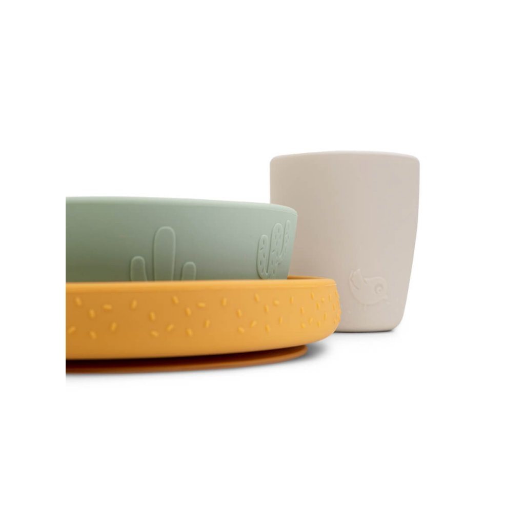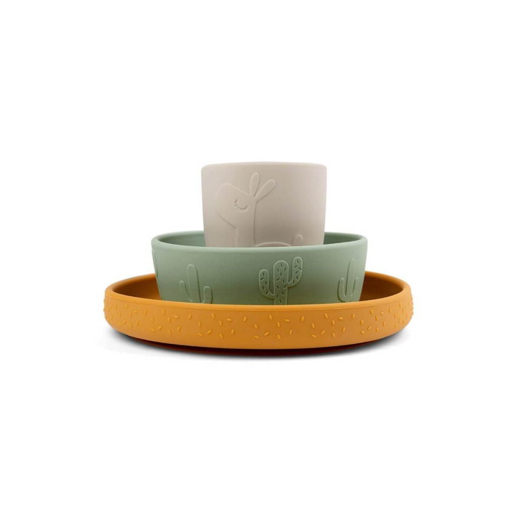 Prostřete zábavný stůl se silikonovým jídelním setem Stick&Stay a Lalee jako cool společníka. Talíř, miska a mini hrnek jsou zdobeny reliéfními vzory s Lalee, Birdee, slavnostními konfetami a kaktusy. Stiskněte talíř a misku dolů a přilnou k většině hladkých povrchů přirozeným přisátím. Tím zabráníte tomu, aby je malí odstrkovali, překlápěli nebo házeli. Nádobí s lamou a ptáčkem je perfektním tipem na dárek pro malé jedlíky. Roztomilé silikonové nádobí je odolné proti rozbití s protiskluzovými a snadno uchopitelnými prvky. Vhodné do myčky nádobí a vhodné pro použití v troubě, mikrovlnné troubě a mrazničce.