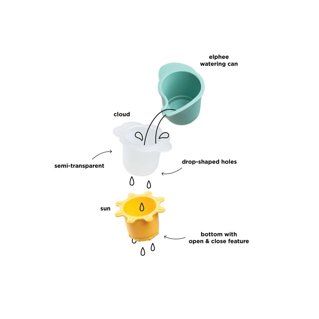 Bavte se s našimi vodními kelímky Elphee na hraní, které jsou ideální pro vnitřní i venkovní vodní aktivity. Tato sada obsahuje růžový kelímek ve tvaru Elphee, poloprůhledný orabžový kelímek ve tvaru květiny se spodními otvory a růžový kelímek ve tvaru slunce s funkcí otevírání a zavírání. Povzbuďte své dítě, aby nalévalo vodu s Elphee, vytvořilo déšť s mrakem a otočilo sluneční kelímek pro poutavou hru. Užijte si smyslové zážitky a trénujte jemné motorické dovednosti prostřednictvím této promyšleně navržené sady, která poskytuje okamžiky nápaditých a zábavných vodních aktivit s naším milým slonem.