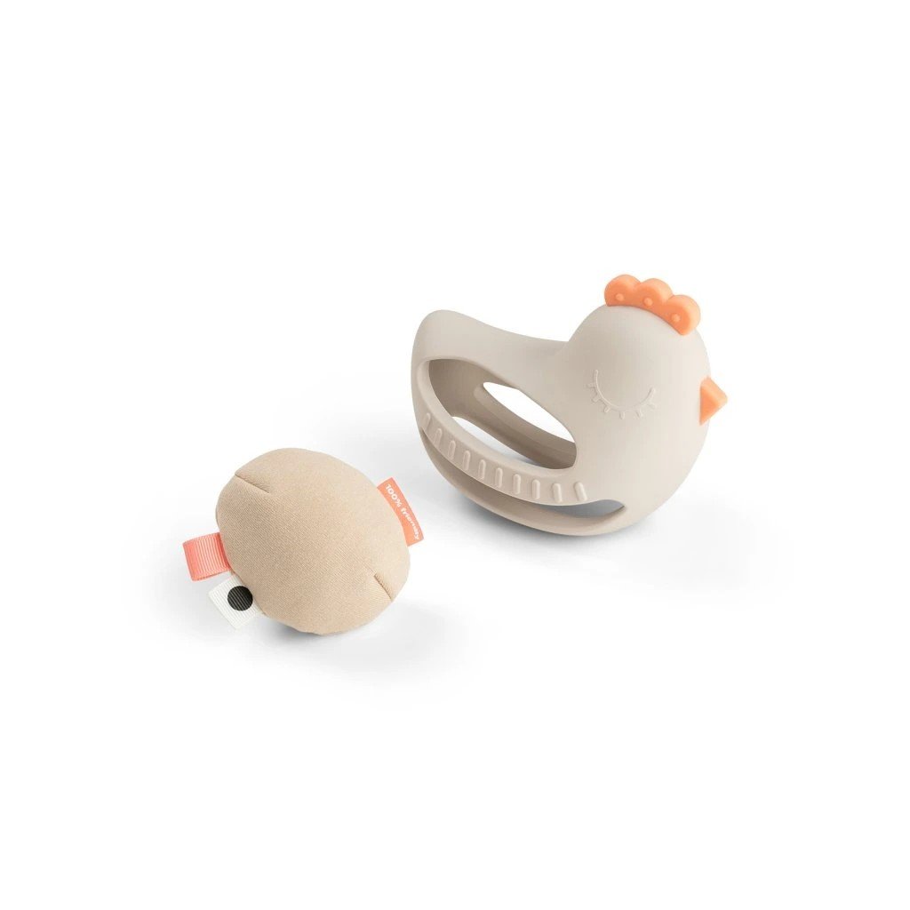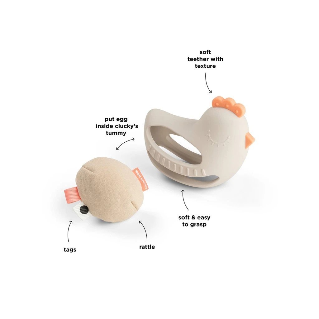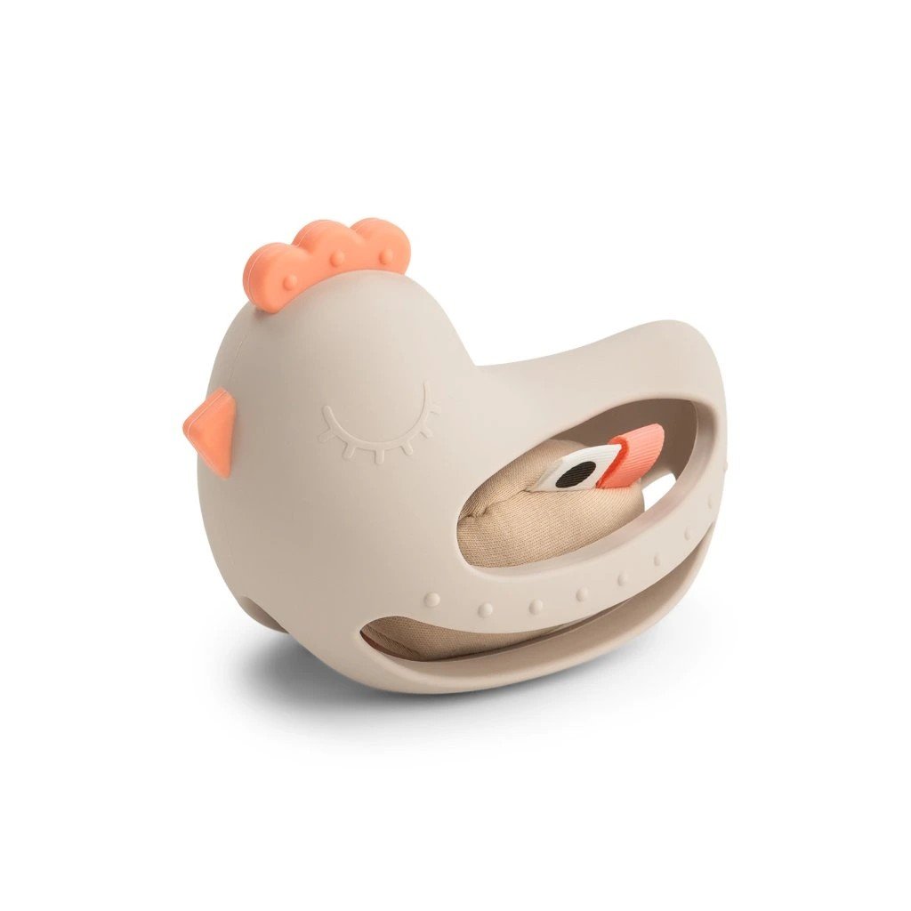 Měkké silikonové kousátko ve tvaru slepičky Clucky. Kousátko se snadno drží v malých ručkách. Roztomilé kousací hračky jsou vyrobeny z měkkého potravinářského silikonu. Kousátko je navrženo tak, aby padlo i do té nejmenší ručičky a stimulovalo zrakové a hmatové smysly dítěte. Měkké vajíčko, které chrastí lze snadno vyndat.