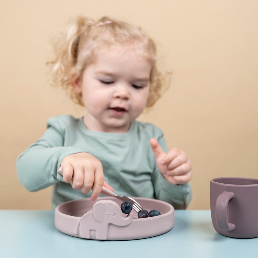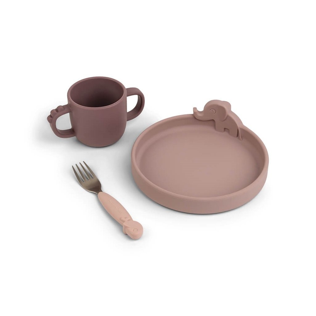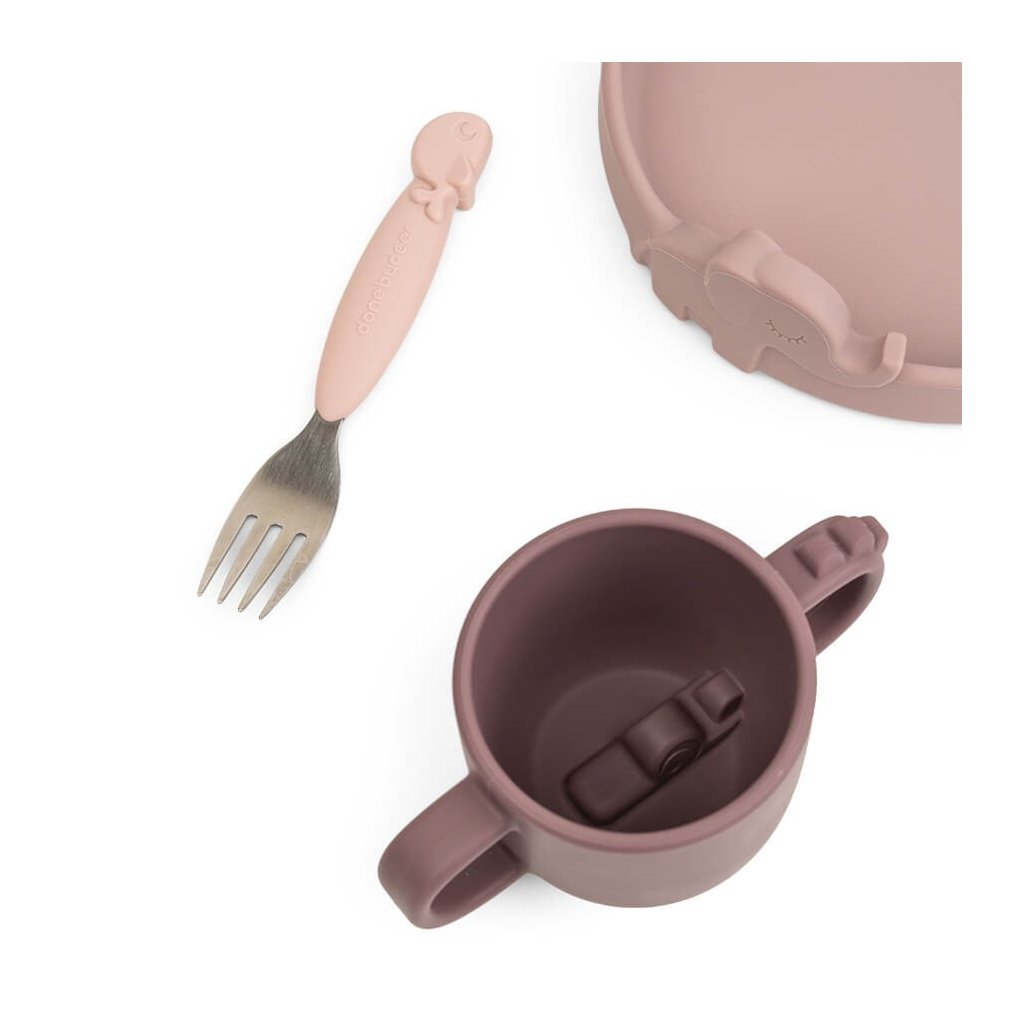 Jídelní set Deer Friends vyrobený ze 100% potravinářského silikonu. Set obsahuje hrneček s oušky, talířek a vidličku. Silikon je měkký a odolný, odolný vůči teplu a vhodný pro použití v mikrovlnné troubě, troubě a mrazničce. Roztomilá sada je ideální dárek pro malé jedlíky.