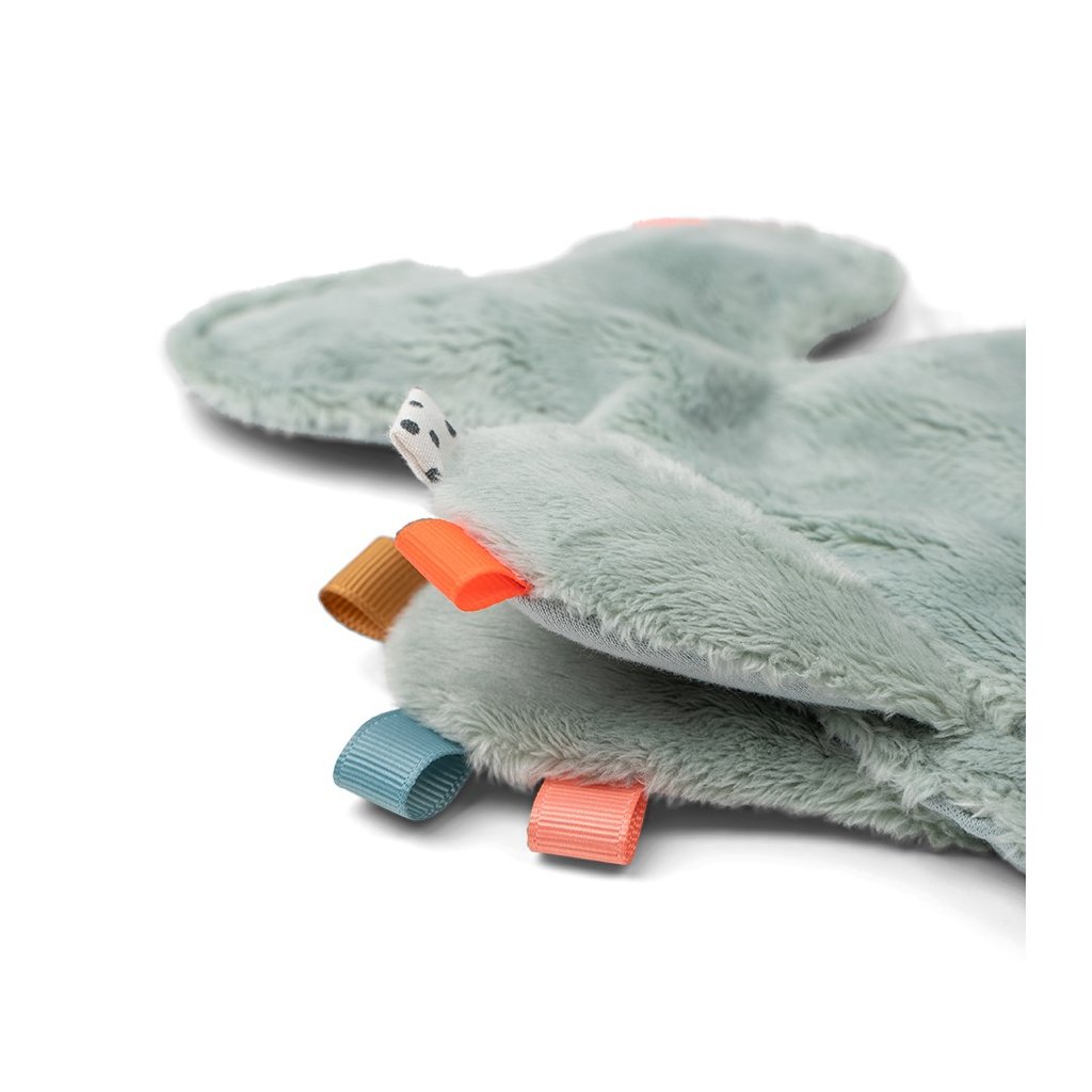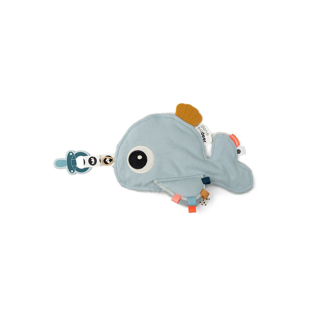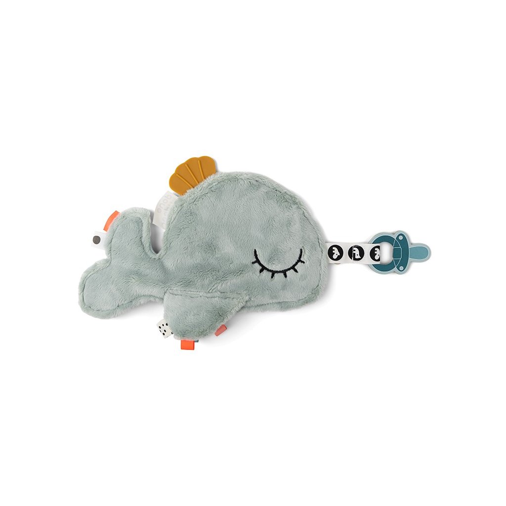 Miminka se mohou pomazlit s měkkou a ospalou velrybou. Prstíky mohou snadno uchopit měkkou ploutev a zabavit se zkoumáním barevných štítků, různých textur a tvarů. Měkké silikonové hryzátko stimuluje a uklidňuje svědění dásní. Roztomilá velryba udrží dudlíky v blízkosti, když děťátko usne. Praktické poutko na suchý zip a elastické poutko umožňuje připevnění dudlíků. Uklidňující přítel z moře je dokonalým společníkem pro vaše dítě.