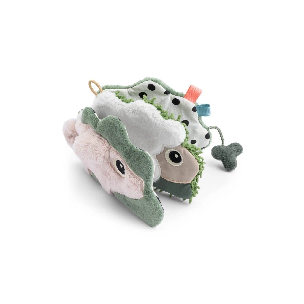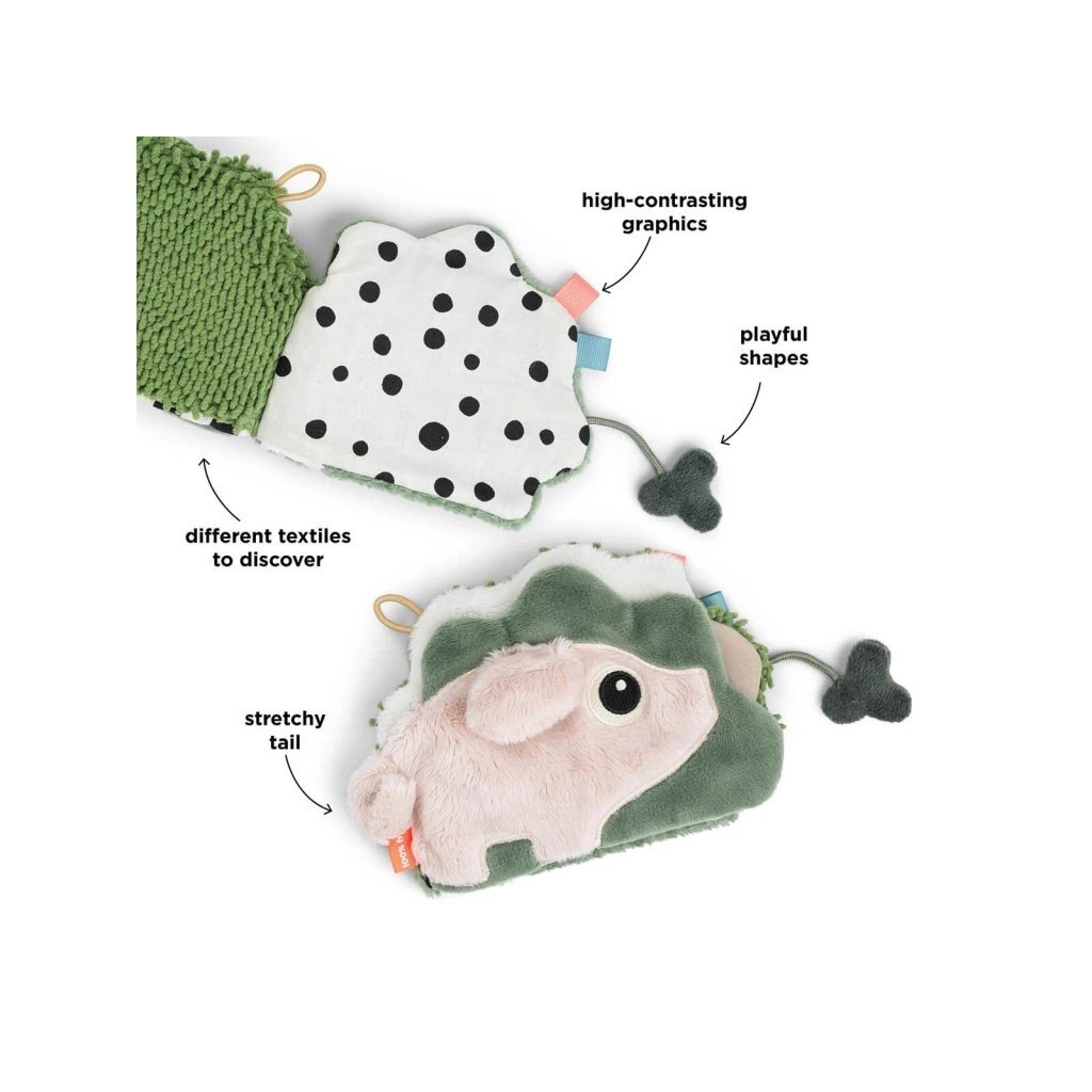 Ponořte se do světa senzorických funkcí s roztomilým přítelem v této měkké dětské knize. Vaše dítě může prozkoumávat, užívat si a objevovat vysoce kontrastní grafiku, zatímco si procvičuje jemnou motoriku s každým otočením stránky. Malé prsty si mohou užít různé textury, otočte stránku a uslyšíte zvuk, zatímco zvědavé oči jsou uchváceny tečkami a pruhy v kontrastních barvách, které stimulují zvědavost Vašeho dítěte. Díky elastickému poutku lze senzorickou dětskou knihu snadno připevnit na hrací podložku, kočárek, autosedačku nebo aktivní hrazdičku pomocí hracího kroužku.
