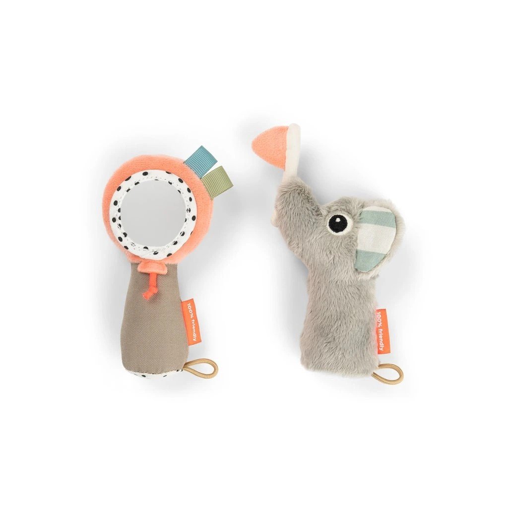 Smyslová chrastítka jsou plná stimulujících funkcí jako je například zrcátko a různé textury, které jsou ideální pro zvídavé malé průzkumníky. Malé děti chrastítko snadno uchopí a když s hračkou zatřese, tak vydá chrastivý zvuk. Chrastítka lze díky poutku snadno připnout na hrací podložku.