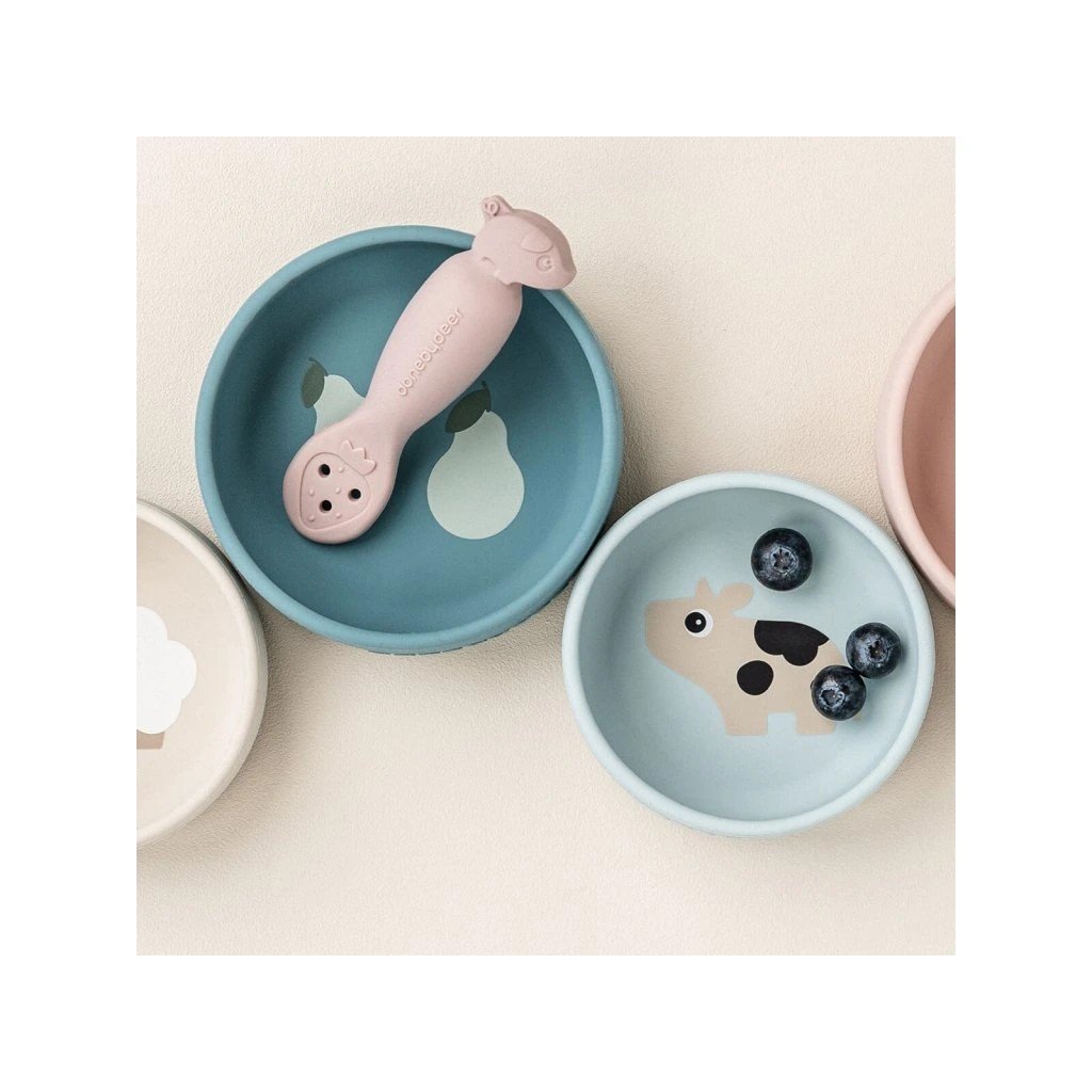 Misky jsou díky zaobleným vnitřním hranám ideální pro snadné nabírání potravin. Když se misky zrovna nepoužívají, perfektně do sebe zapadají. Miska je vyrobena z potravinářského silikonu, díky čemuž je odolná proti rozbití a vhodná pro použití v mikrovlnné troubě, troubě, mrazničce a myčce nádobí a má protiskluzové vlastnosti. Malé děti si užijí společné občerstvení se zvířátky.