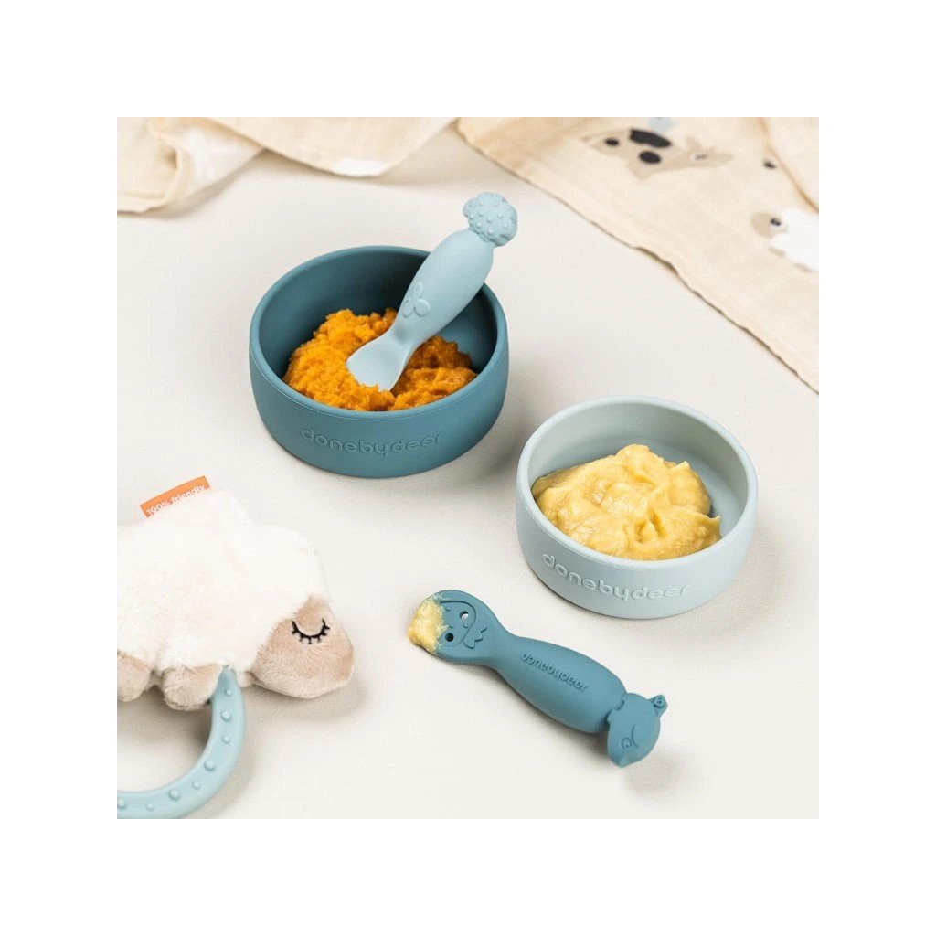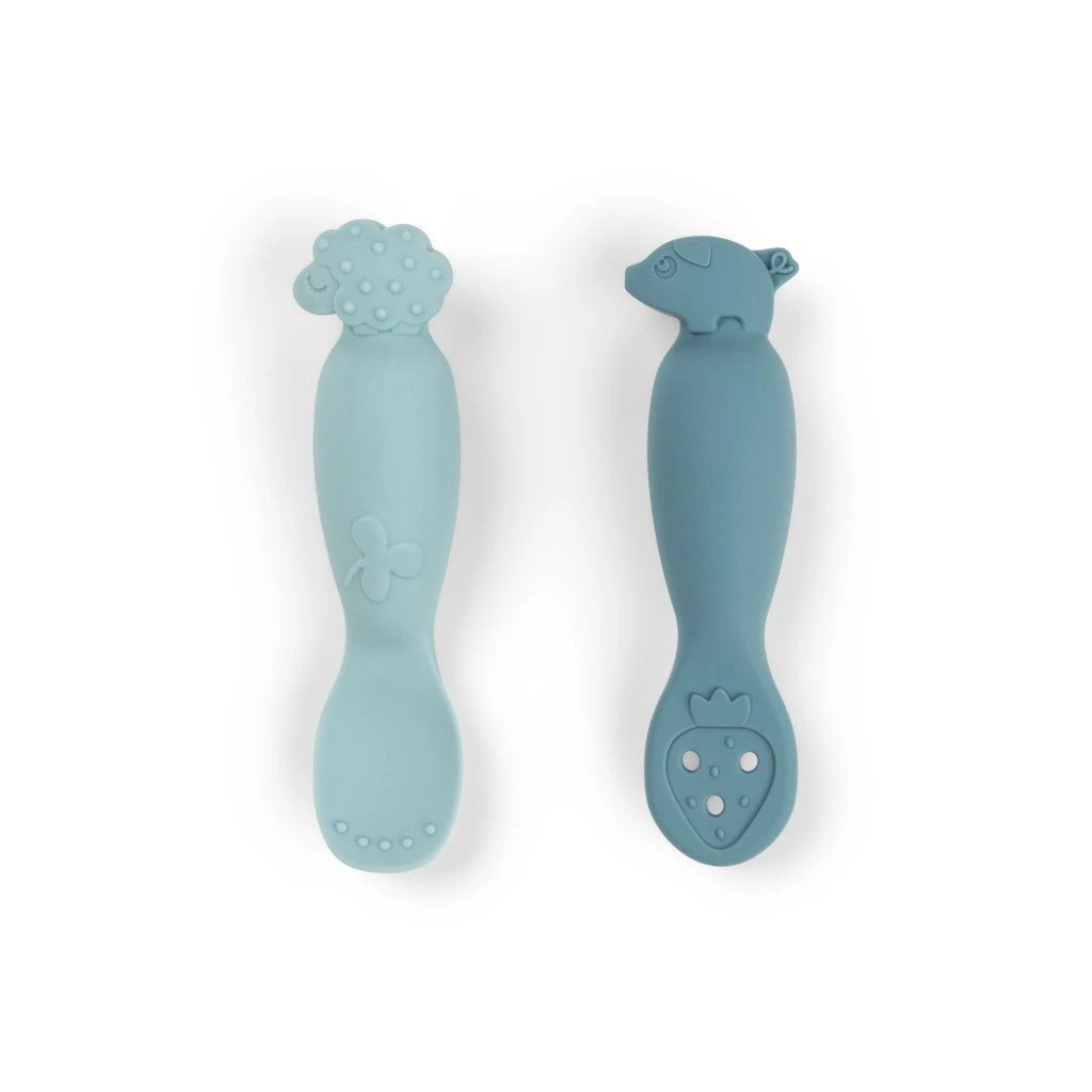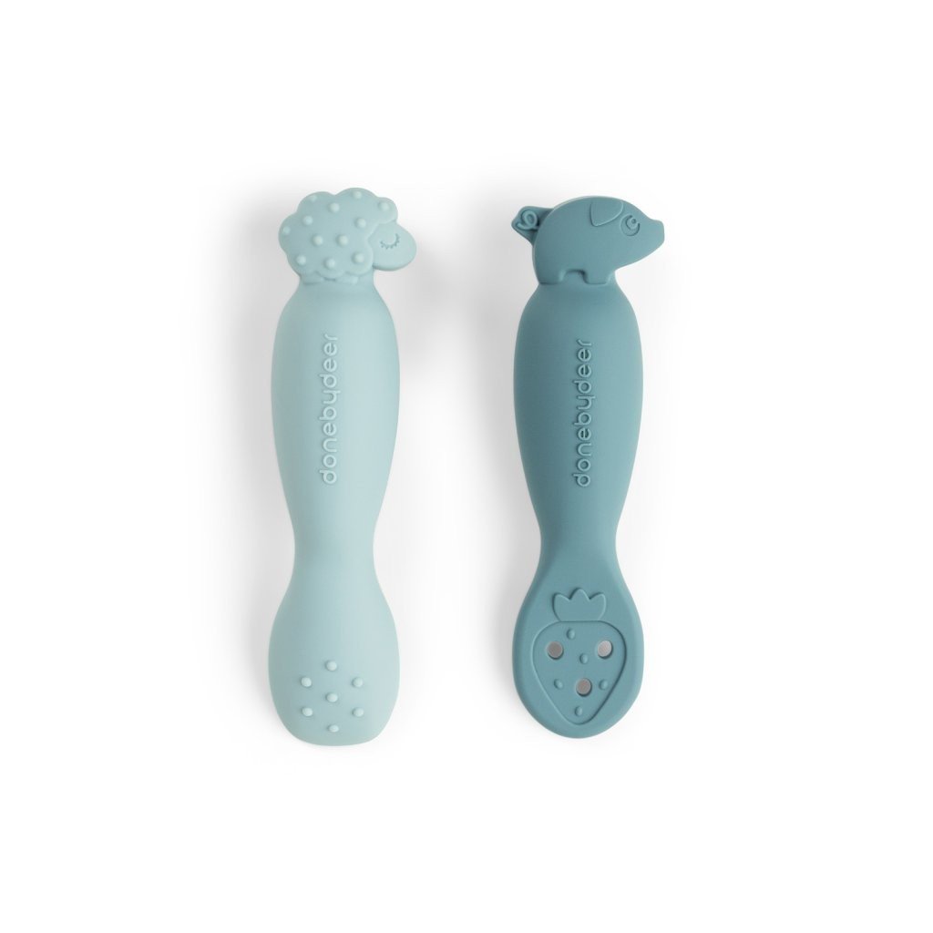 DONE BY DEER Silikonové lžičky Tiny farm 2ks modré