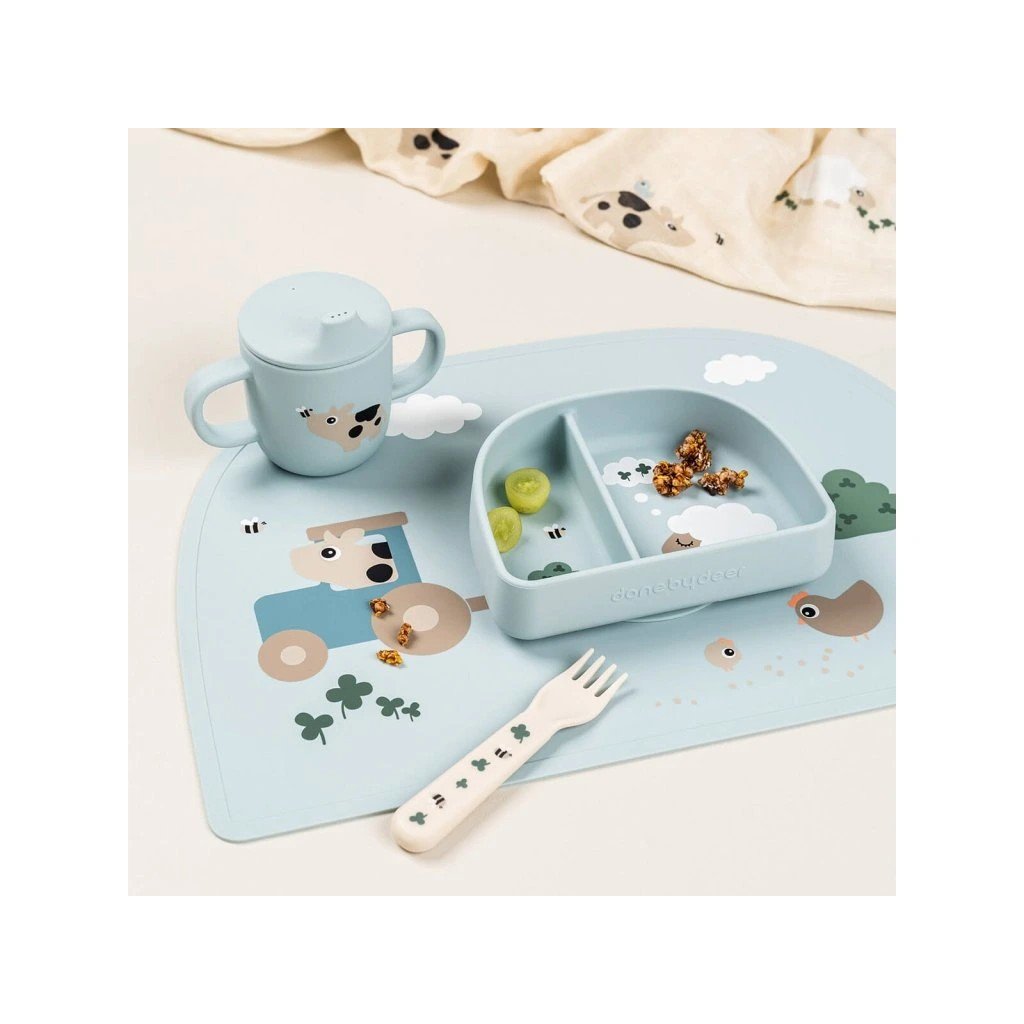 DONE BY DEER Silikonový hrneček s pítkem Tiny farm modrý