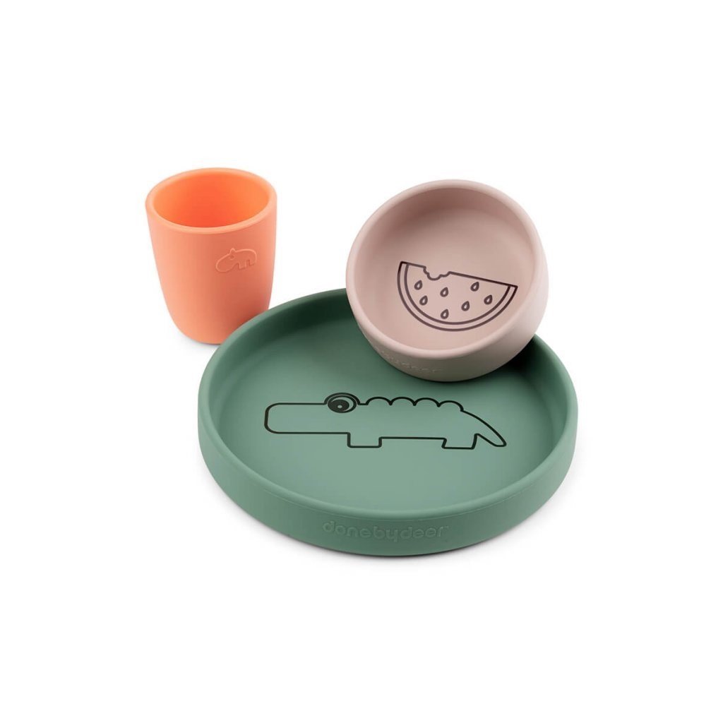 Silikonová jídelní souprava s jelením přítelem a veselými barvami udělá z jídla zábavu. Praktická protiskluzová a snadno uchopitelná silikonová startovací sada obsahuje dětský talíř, misku a mini hrnek. Perfektní nádobí pro kojence a batolata. Zaoblené vnitřní okraje usnadňují nabírání jídla. Silikon je měkký a odolný, tepelně odolný a vhodný pro použití v mikrovlnné troubě, troubě, mrazáku i myčce. Perfektní tip na dárek pro malé jedlíky.