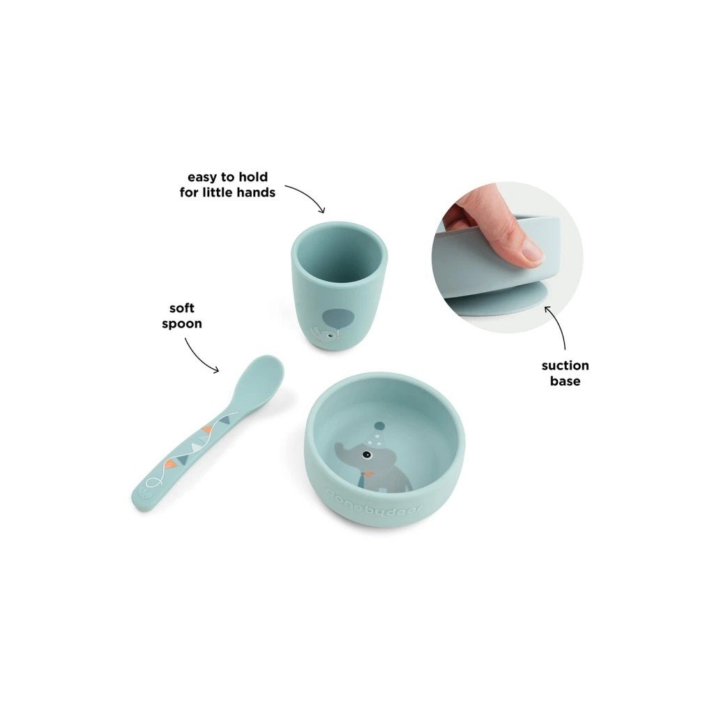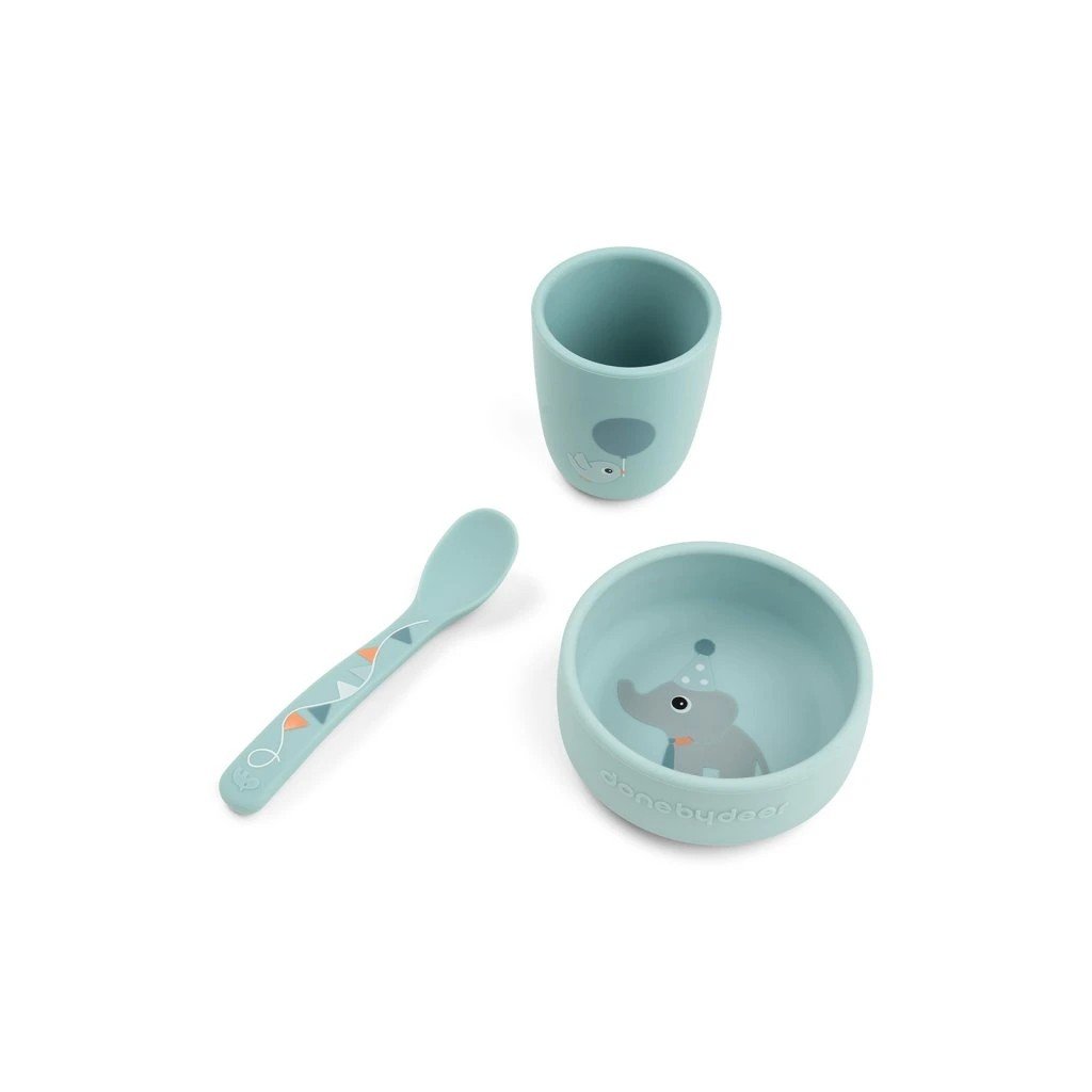 Jídelní sada obsahující misku, lžičku a mini hrnek. Přísavky na misce udrží nádobí na místě během jídla. Velikost hrnečku je akorát pro malé dětské ručičky. 100% potravinářský silikon bez obsahu BPA je bezpečný pro děti. Nádobí v jemných odstínech s detaily roztomilých Deer friends. Perfektní dárek pro malé jedlíky.