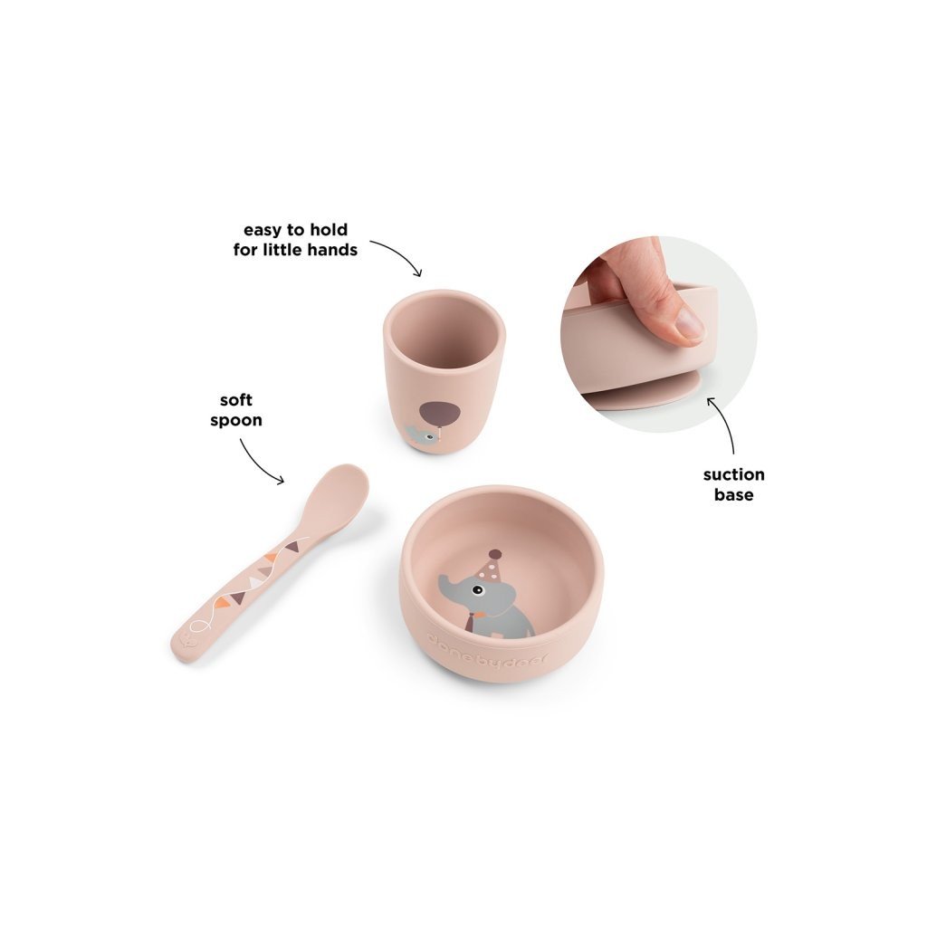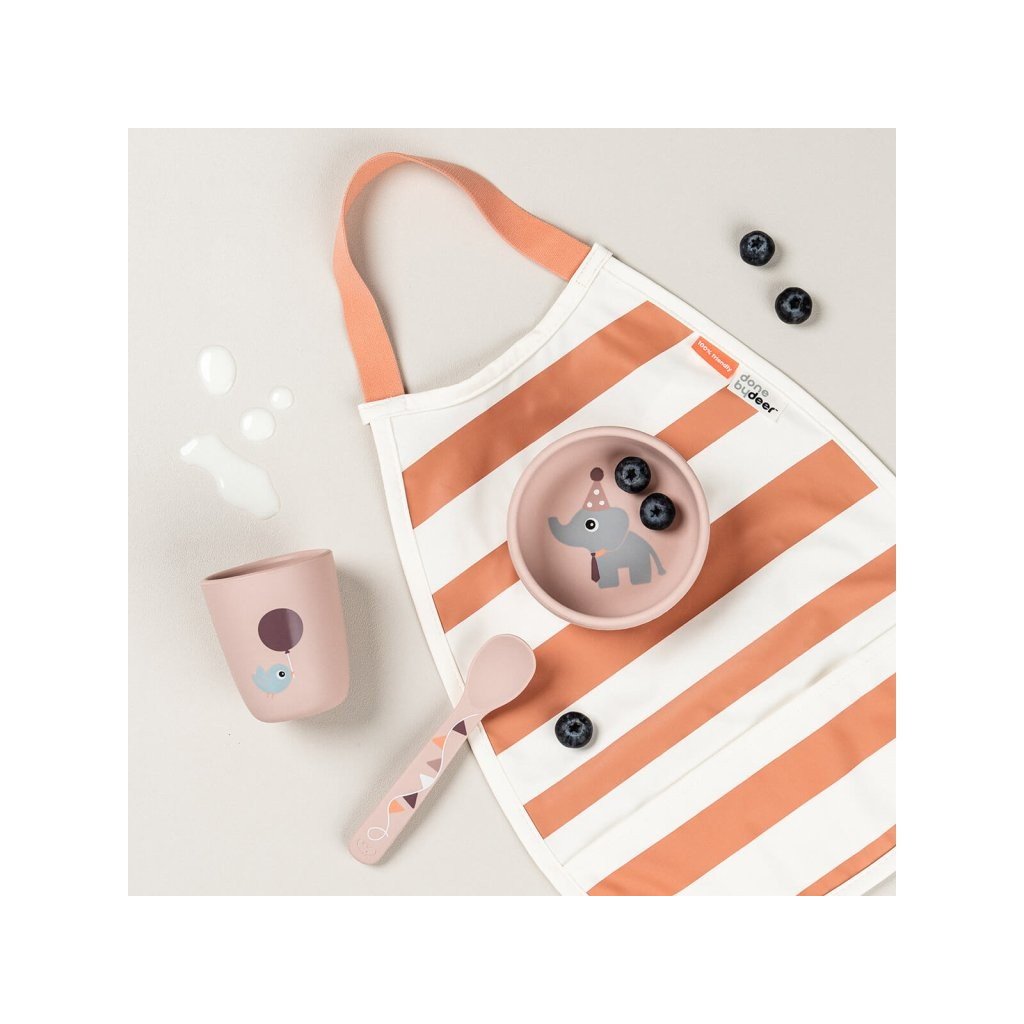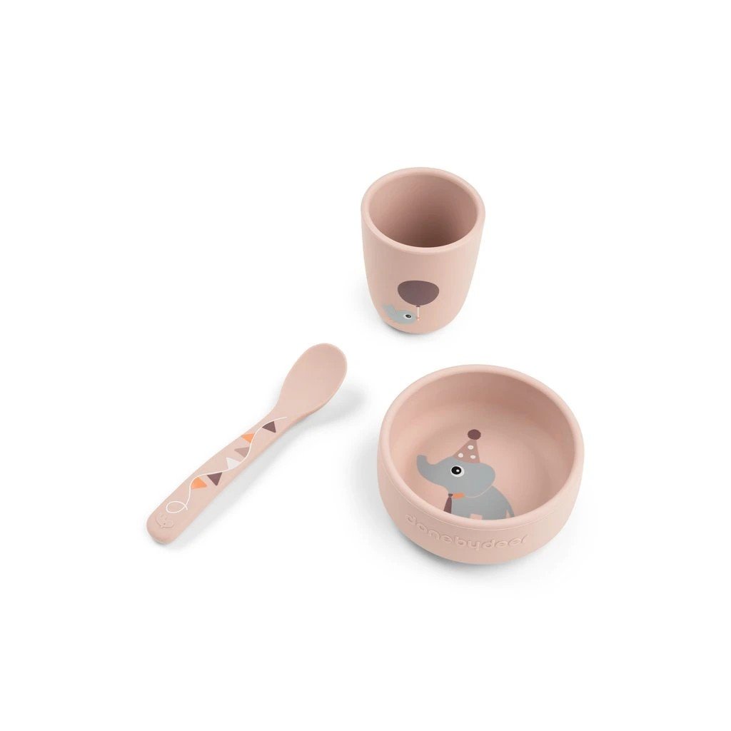 Jídelní sada obsahující misku, lžičku a mini hrnek. Přísavky na misce udrží nádobí na místě během jídla. Velikost hrnečku je akorát pro malé dětské ručičky. 100% potravinářský silikon bez obsahu BPA je bezpečný pro děti. Nádobí v jemných odstínech s detaily roztomilých Deer friends. Perfektní dárek pro malé jedlíky.