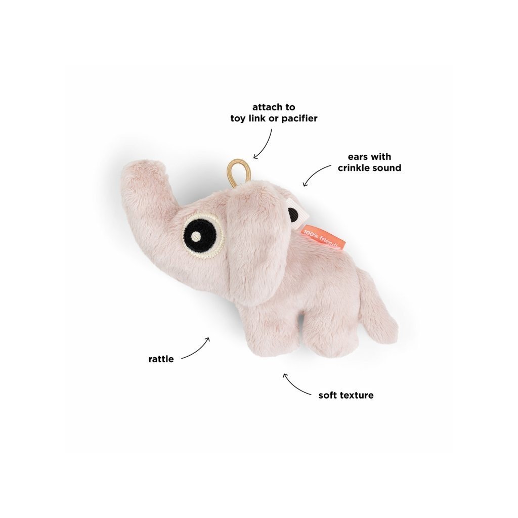 Elphee miluje hraní s Vašimi nejmenšími. Chrastítko je perfektní jako první hračka pro malé prstíky k uchopení - připravena objevit smyslové rysy a sladké zvuky. Zkuste jemně stisknout Elpheeho ouška a uslyšíte zvuk. Malé prstíky ucítí měkkou strukturu dětské hračky, zatímco zvuky chrastítka vyvolají zvědavost k prozkoumání. S elastickým poutkem lze chrastítko snadno připevnit na podložku, kočárek, autosedačku nebo aktivní hrazdičku.