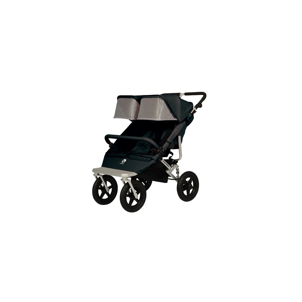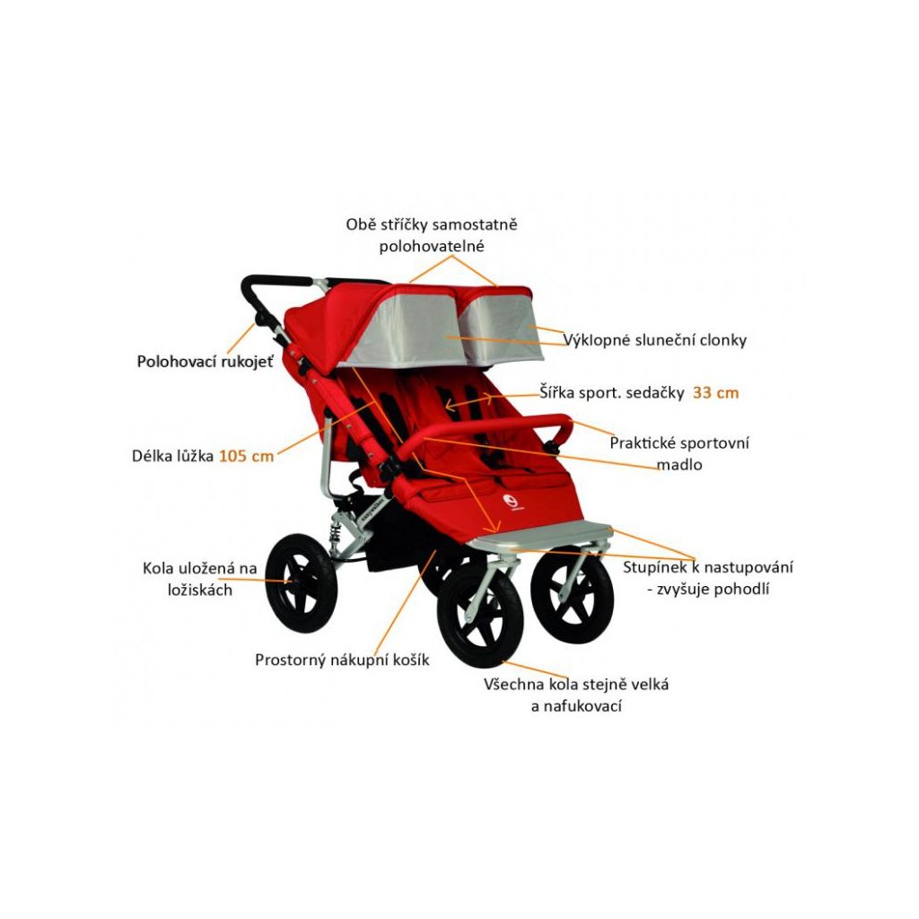 Při koupi modelu Duo Plus získáte konstrukci a dvě sportovní sedátka, která jsou vhodná pro děti přibližně od 6 měsíců do 3 let. Sedáky jsou polstrované a každý z nich je zvlášť polohovatelný (3 polohy, až do lehu). Tím je zaručen maximální komfort pro každé dítě. Jeho součástí je i praktická stříška s integrovanou sluneční clonou. Sedačka je široká 30 cm. Praktická je také přepážka mezi dětmi, díky které zamezíte jejich vzájemnému pošťuchování nebo buzení se. Samozřejmostí je i 5bodový bezpečnostní pás.