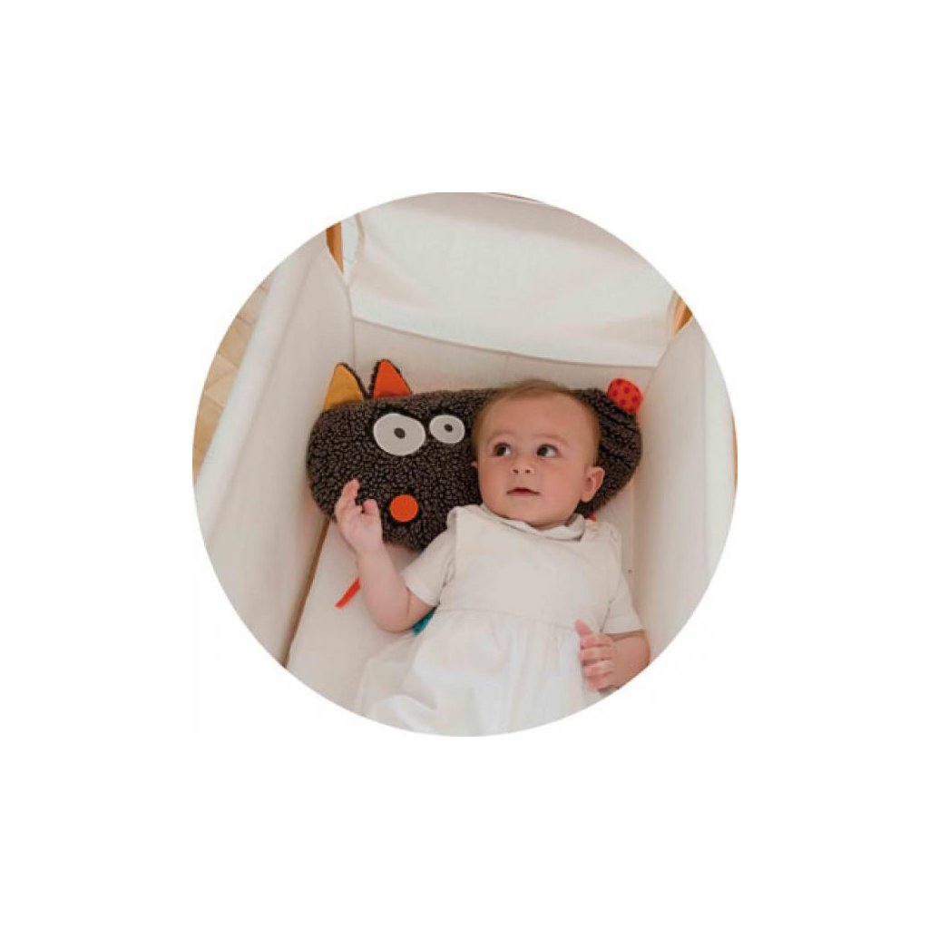 Deka s hrazdou nabízí příjemné místo pro děti hrající si na zemi. Na odepínatelné hrazdě jsou 4 hračky s různými aktivitami, které se dají připnout také na okraj deky, nebo je lze odepnout úplně a dítě si tak s nimi může hrát samostatně. Stejně tak je možné odepnout hlavu vlka a použít ji např. jako polštářek.
