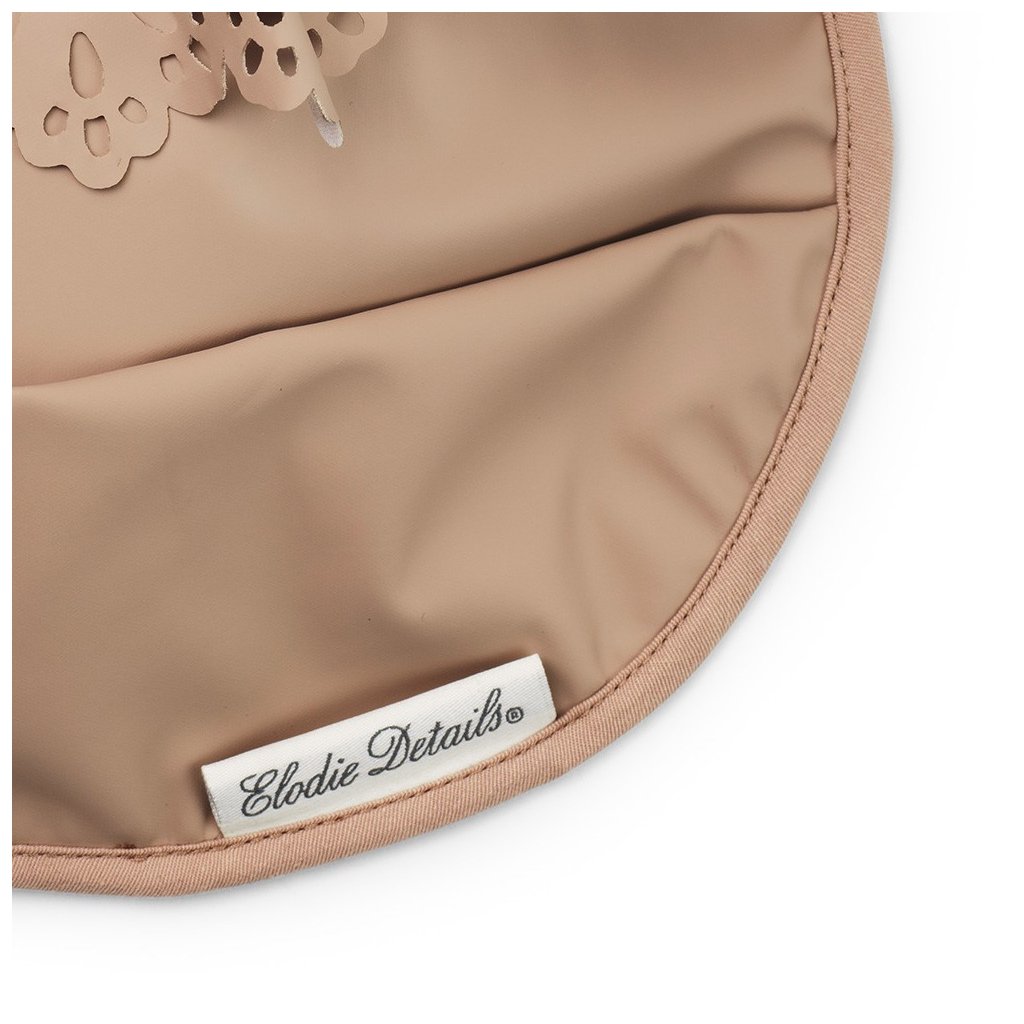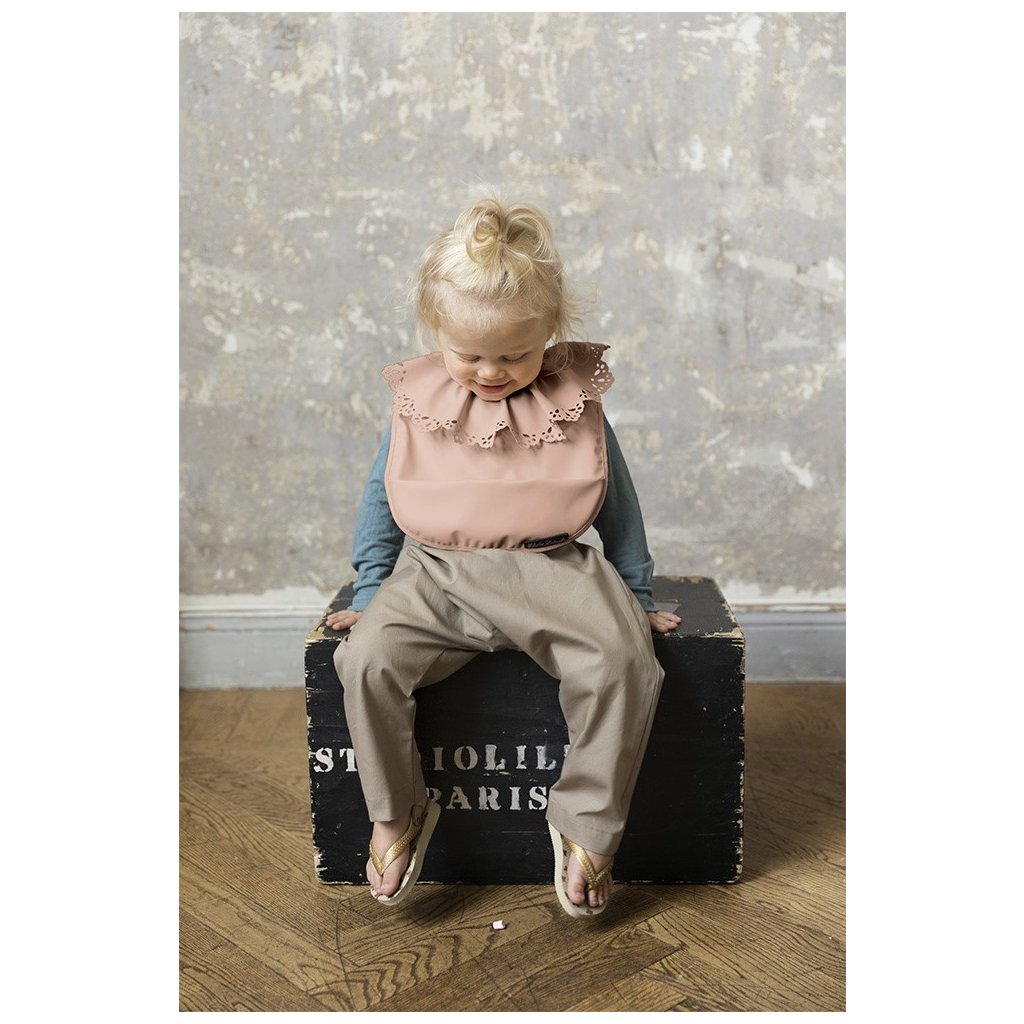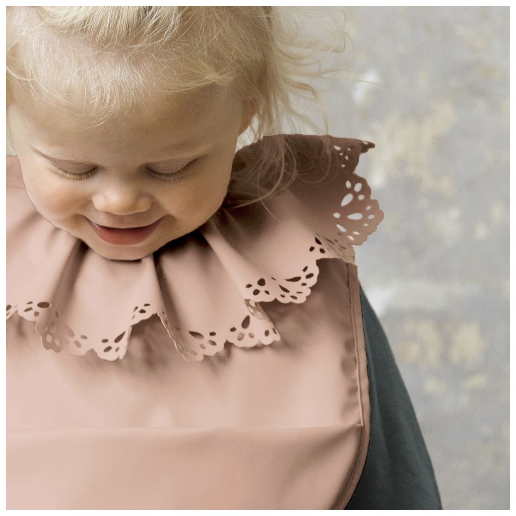 Designový bryndák je potažen pogumovanou vrstvou, aby byl snadno umyvatelný a rychle čistý po každém použití. Přední kapsa zachytí drobky, kapky pití či zbytky jídla. Bryndák se snadno nasazuje a sundává díky zapínání na suchý zip. Vyrobeno bez použití PVC. Bryndák má starorůžovou barvu s perforovanými křidélky.