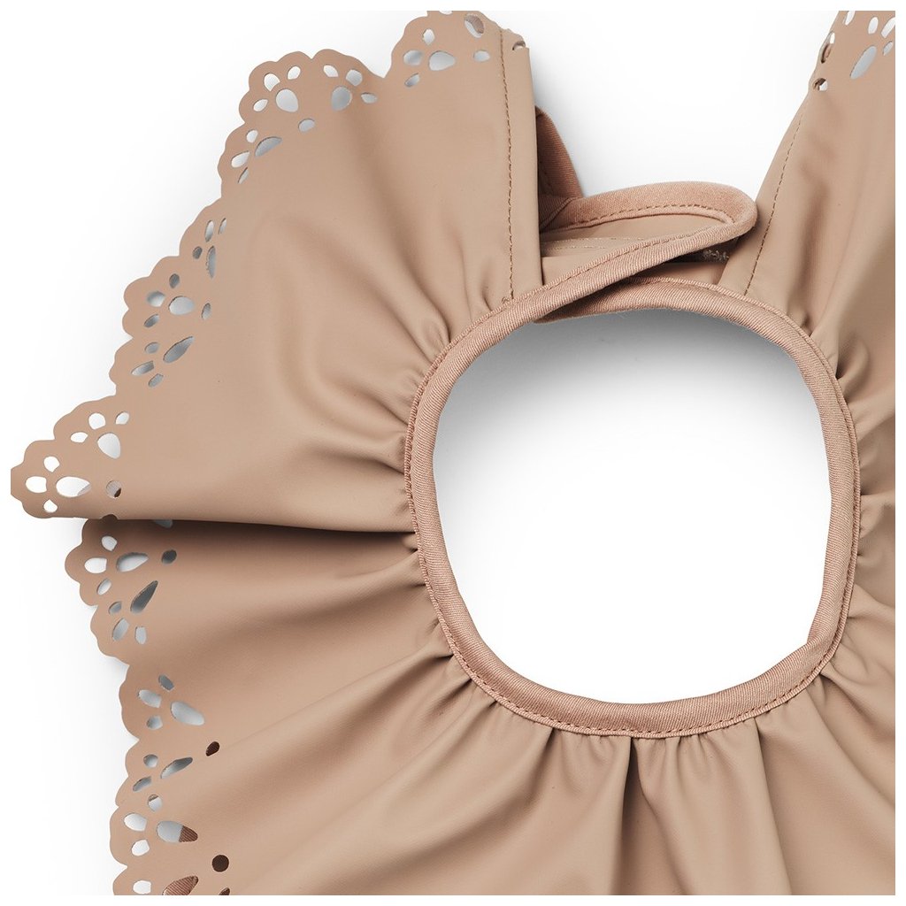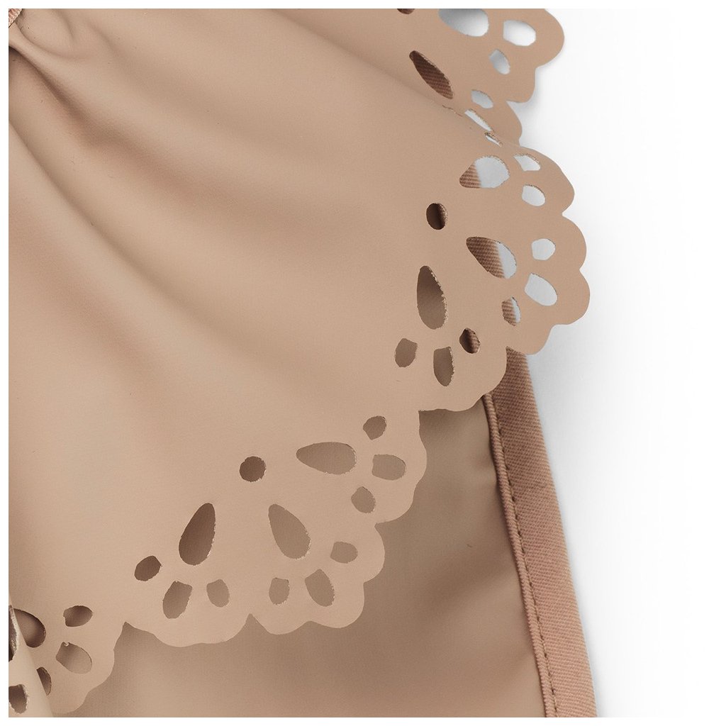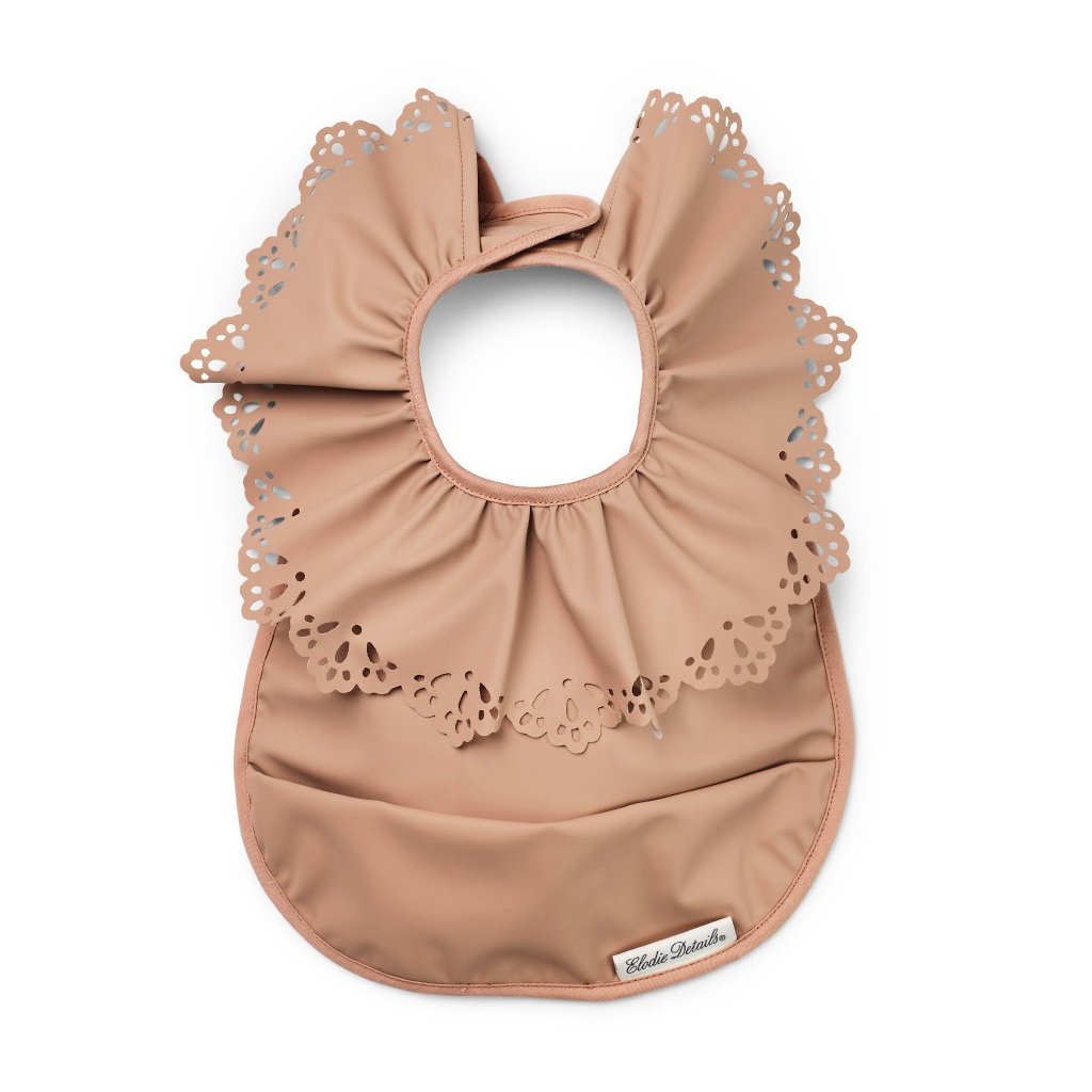 Designový bryndák je potažen pogumovanou vrstvou, aby byl snadno umyvatelný a rychle čistý po každém použití. Přední kapsa zachytí drobky, kapky pití či zbytky jídla. Bryndák se snadno nasazuje a sundává díky zapínání na suchý zip. Vyrobeno bez použití PVC. Bryndák má starorůžovou barvu s perforovanými křidélky.