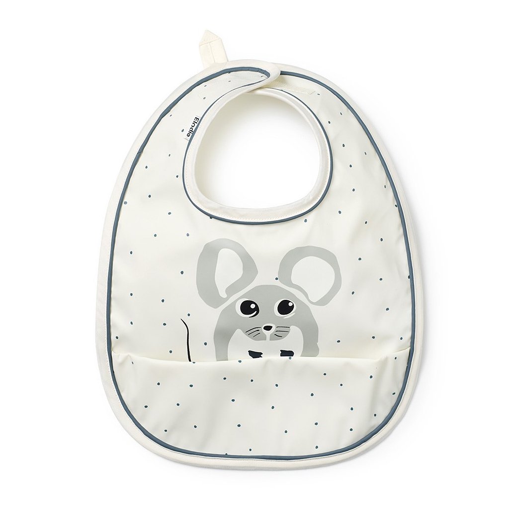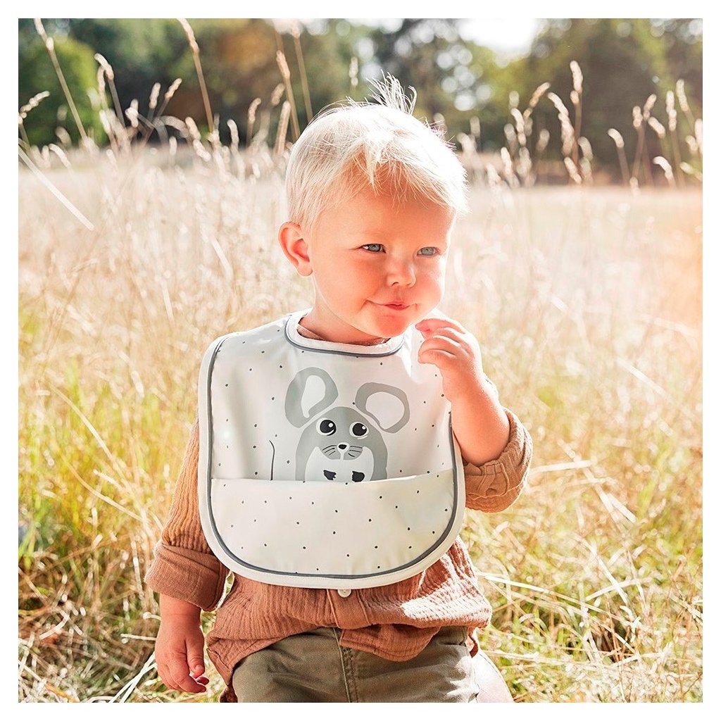 Praktický bryndák na suchý zip je vyroben z pogumovaného omyvatelného materiálu. Kapsa v dolní části zachytí drobky, kapky pití či zbytky jídla. Bryndák má krémovou barvu s motivem myšky.