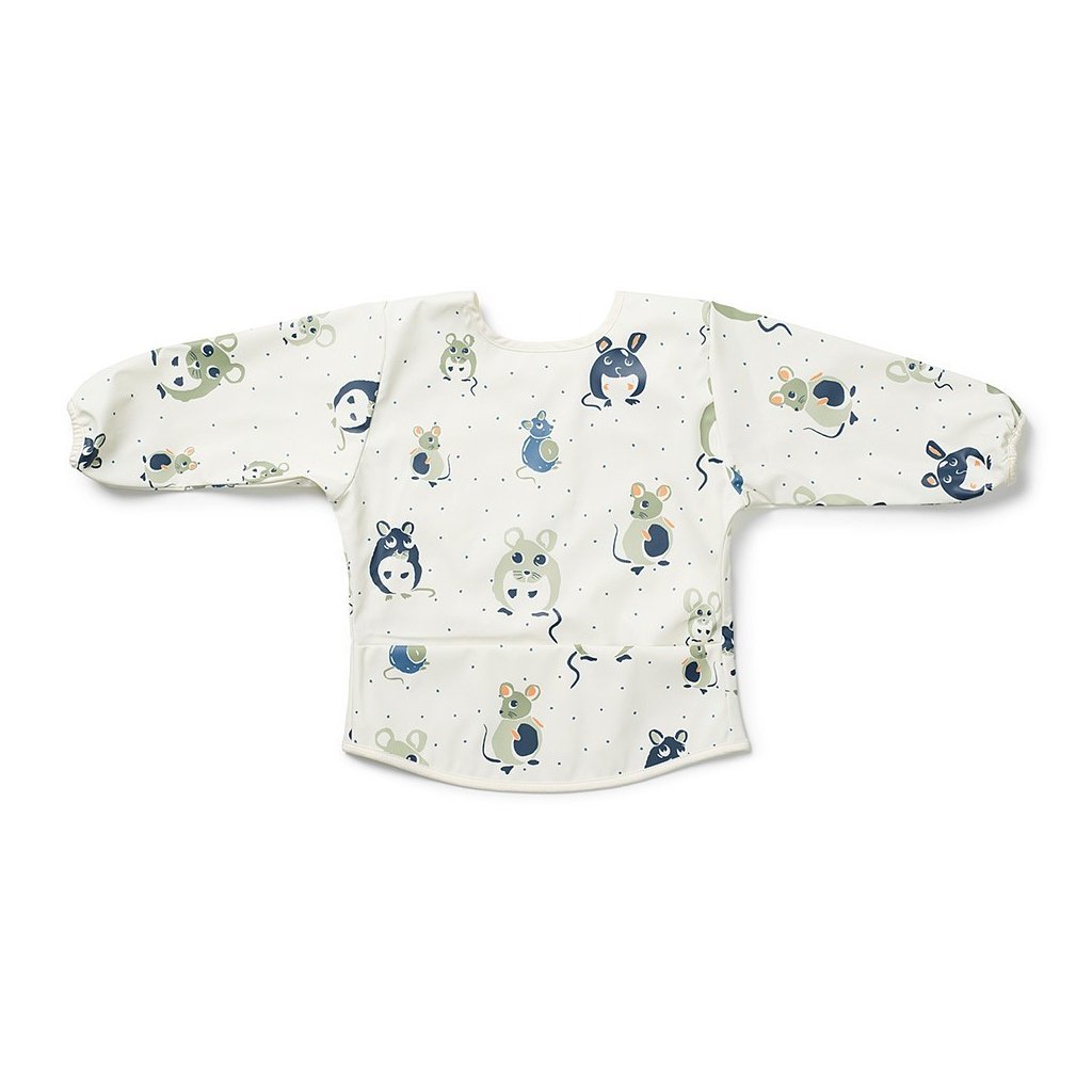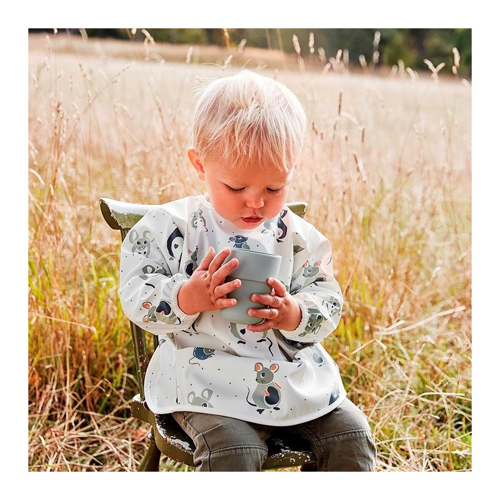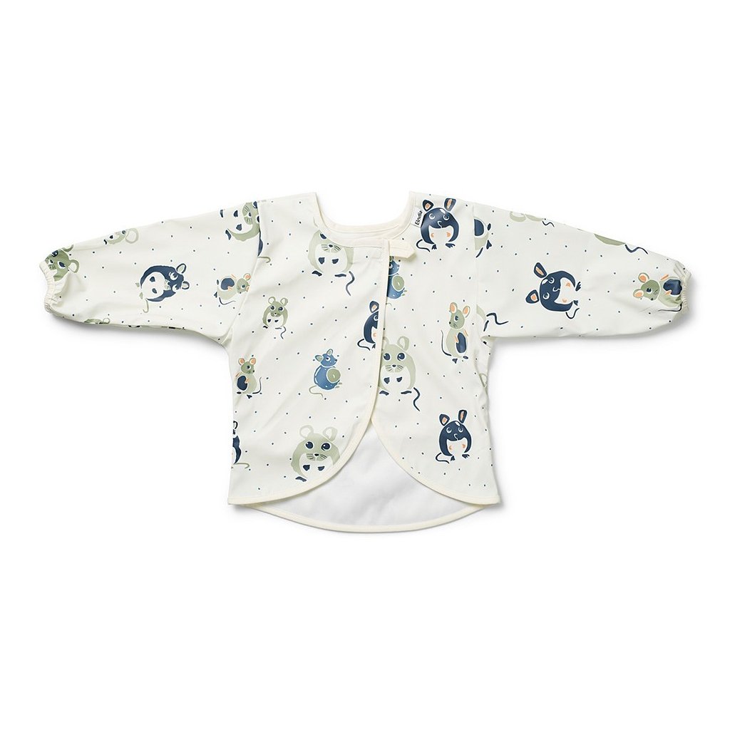 Tento praktický bryndák s dlouhými rukávy uchová vaše děťátko v čistotě během krmení, ale také ve chvílích tvoření, například při kreslení vodovkami. V přední části je vybaven kapsou, která zachytí stékající nečistoty nebo drobky. Bryndák se snadno obléká a ještě snáze udržuje. Je vyroben ze 100% polyesteru s PU vrstvou a lze ho prát na 40 °C. Tento bryndák má krémovou barvu s motivem myšek. Velikost vhodná pro děti od 1-3 let.