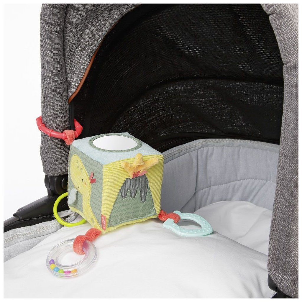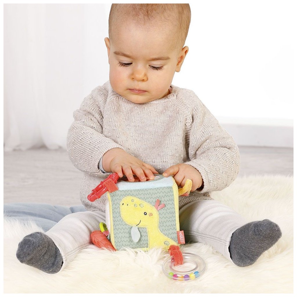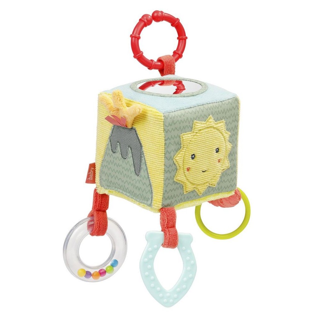 Kompaktní rozměr měkké plyšové kostky umožňuje pohodlný úchop i malými dětskými ručičkami. Rozmanité barvy a přívěsky zvou ke hře a prozkoumávání. Miminko se může vidět v malém zrcátku, vydávat zvuky chrastítkem či zvonečkem. Kostka rozvíjí fantazii a jemnou motoriku. Pomocí praktického kroužku lze kostku snadno připevnit na kočárek, autosedačku či na postýlku.