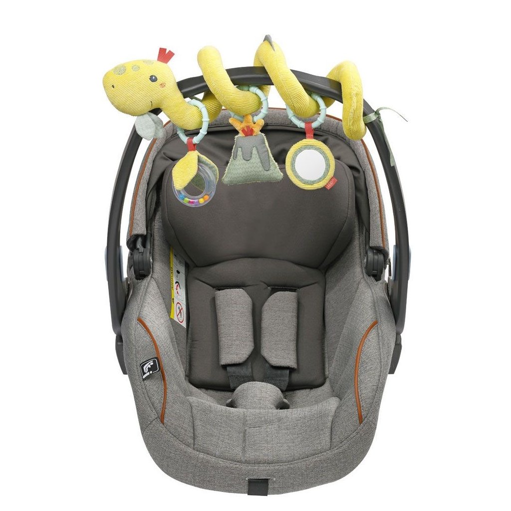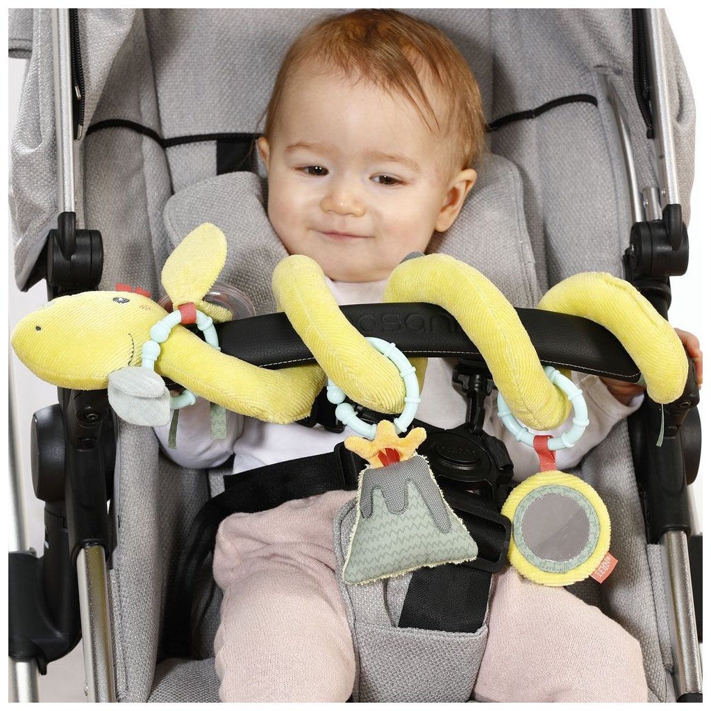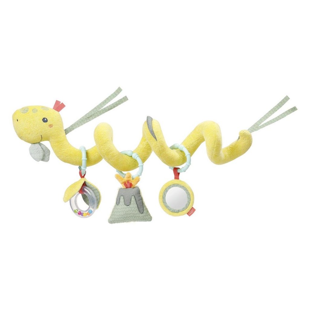 Roztomilá spirála ve tvaru dinosaura obsahuje chrastící kroužek, pískátko, šustící papír, zrcátko a zvuky. Pohyblivé prvky zvou dítě k pozorování, hraní a manipulaci, což rozvíjí fantazii, smysly, koordinaci a motoriku. Praktické upevňovací stuhy umožňují hračku snadno přivázat na postýlku, ohrádku, autosedačku či kočárek.