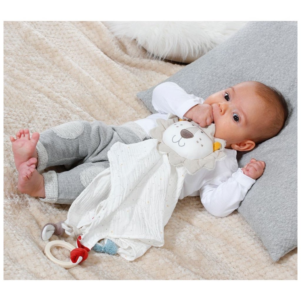 Roztomilý muchláček lvíček se stane nerozlučným kamarádem děťátka. V krásném pastelově barevném provedení a z příjemného materiálu je vhodný jak pro holčičku, tak pro chlapečka. Brouček se dá rozložit na čtyři křidélka, přičemž každé je zakončené uzlíky. Vepředu je výšivka kytiček.