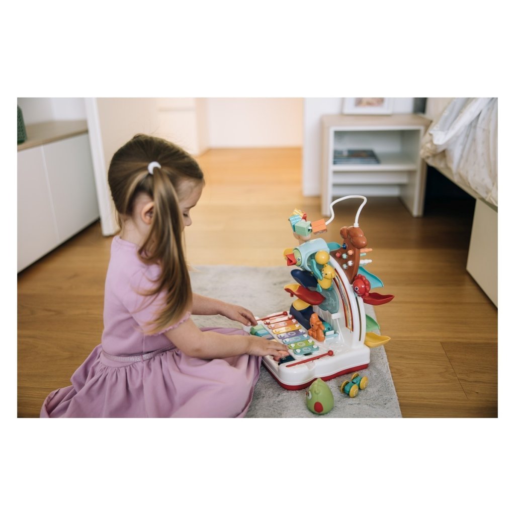 Hledá vaše dítě chvíli autíčko na dráze a vzápětí hudební nástroje? Free2Play Fun Interaktivní strom nabízí pestrý svět her, který děti jen tak neomrzí. Tento multifunkční herní strom kombinuje pohyb, hudbu i objevování a přirozeně podporuje celkový rozvoj dítěte zábavnou formou. Díky různorodým aktivitám si děti procvičují jemnou motoriku, koordinaci ruky a oka, kreativitu i hudební vnímání. Každá strana stromu přináší nové možnosti ke hraní, učení a objevování.