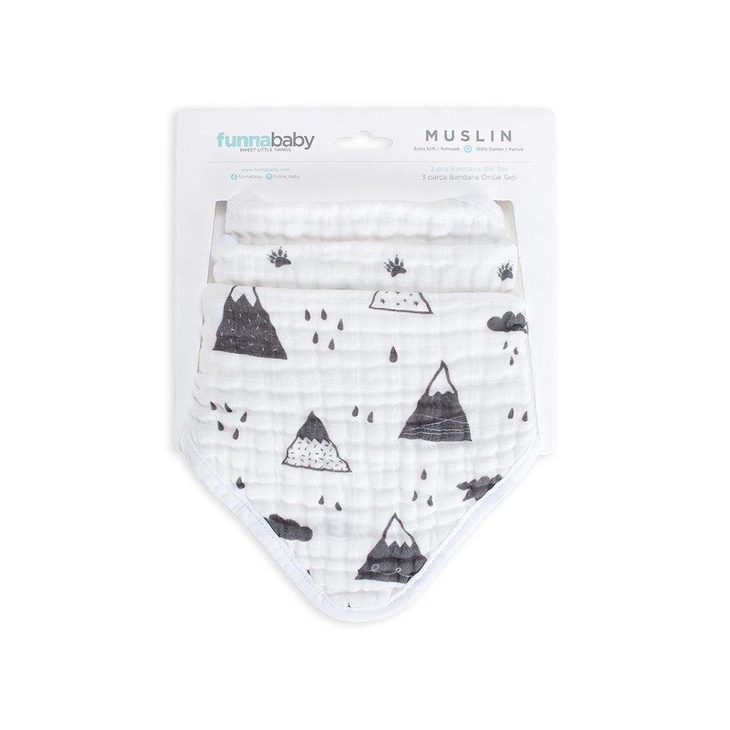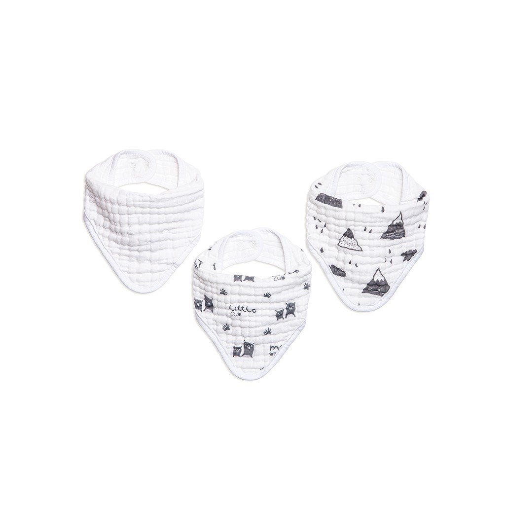 Set krásných mušelínových bryndáčku/slintáčků. Bryndáček lze díky tvaru a designu použít i jako doplněk k oblečení. Ochrání oblečení vašich nejmenších před ušpiněním a zbrání neustále mokrému oblečení. Brydnáčky jsou díky mušelínové úpravě dokonale prodyšné a nedráždí kůži dítěte. Bryndáčky mají zapínání na patenty a lze také upravit velikost.