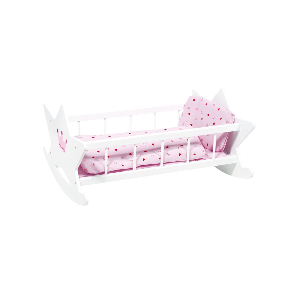 Bílá kolébka z masivního dřeva pro panenky. Kolíbka je kvalitní a stabilní, ošetřena bílým lakem a ozdobena růžovou korunkou.